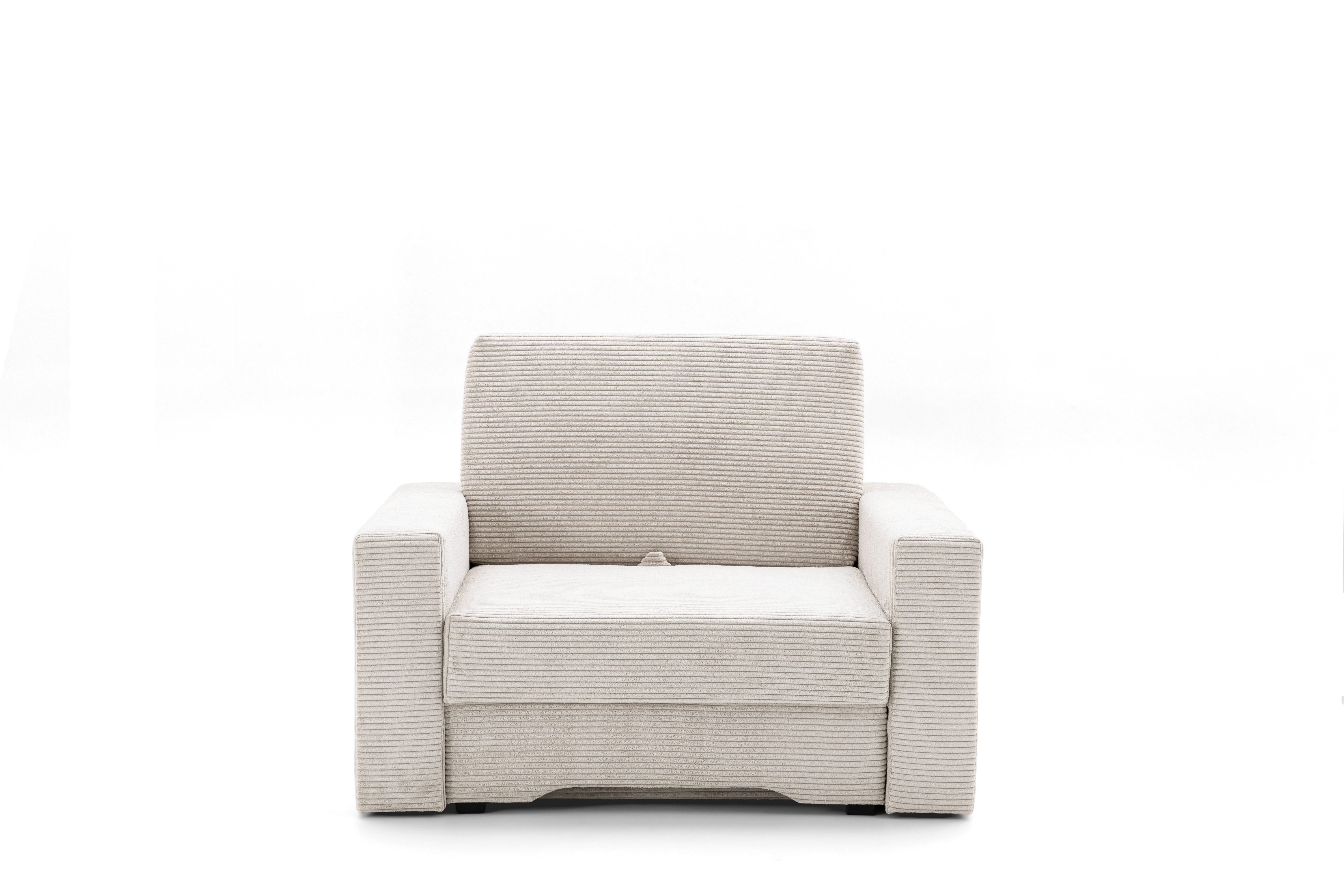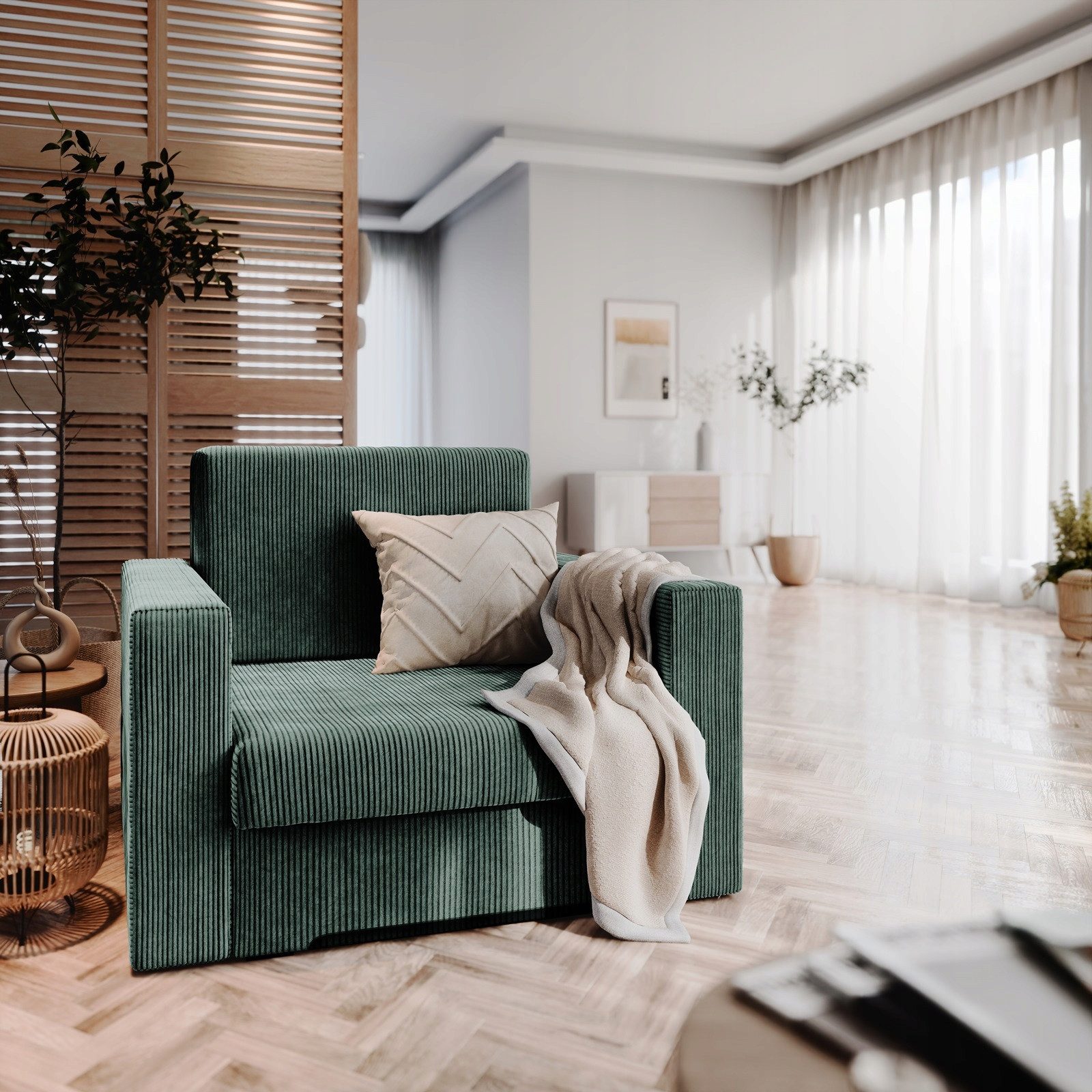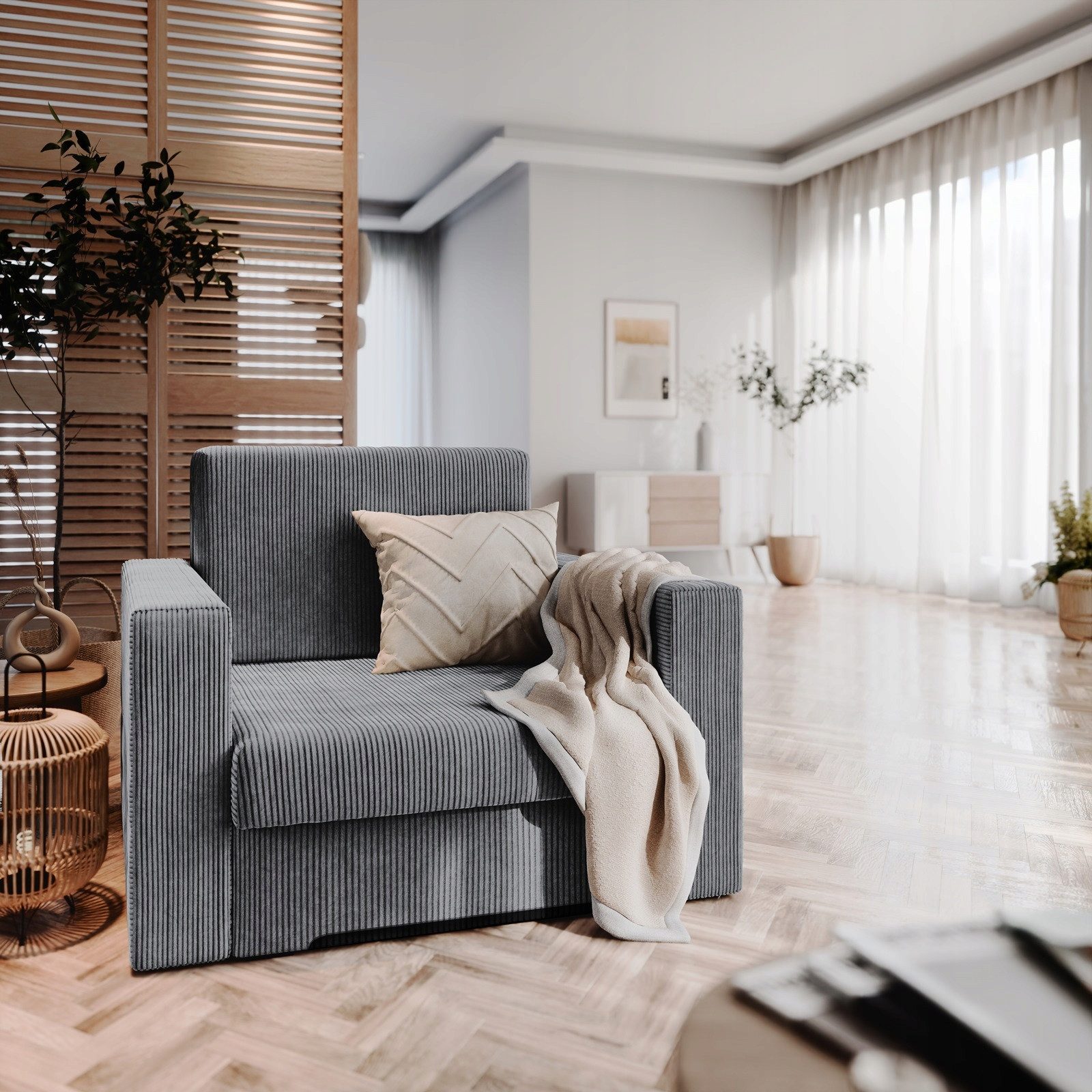 Der Sessel ist mit hochwertigem T30-Schaum gefüllt, der Elastizität, Komfort und Verformungsbeständigkeit garantiert. Zusätzliche Unterstützung bietet die verwendete Wellenfeder, die den Sitz nicht nur weich, sondern auch solide stützt. Die Polsterung besteht aus einem strapazierfähigen und angenehmen Stoff mit gerippter Struktur - ästhetisch ansprechend und pflegeleicht. Der Sessel verfügt über ein einfaches und bequemes Aufklappsystem, mit dem er sich schnell in ein Bett mit einer idealen Liegefläche für eine Person verwandeln lässt.