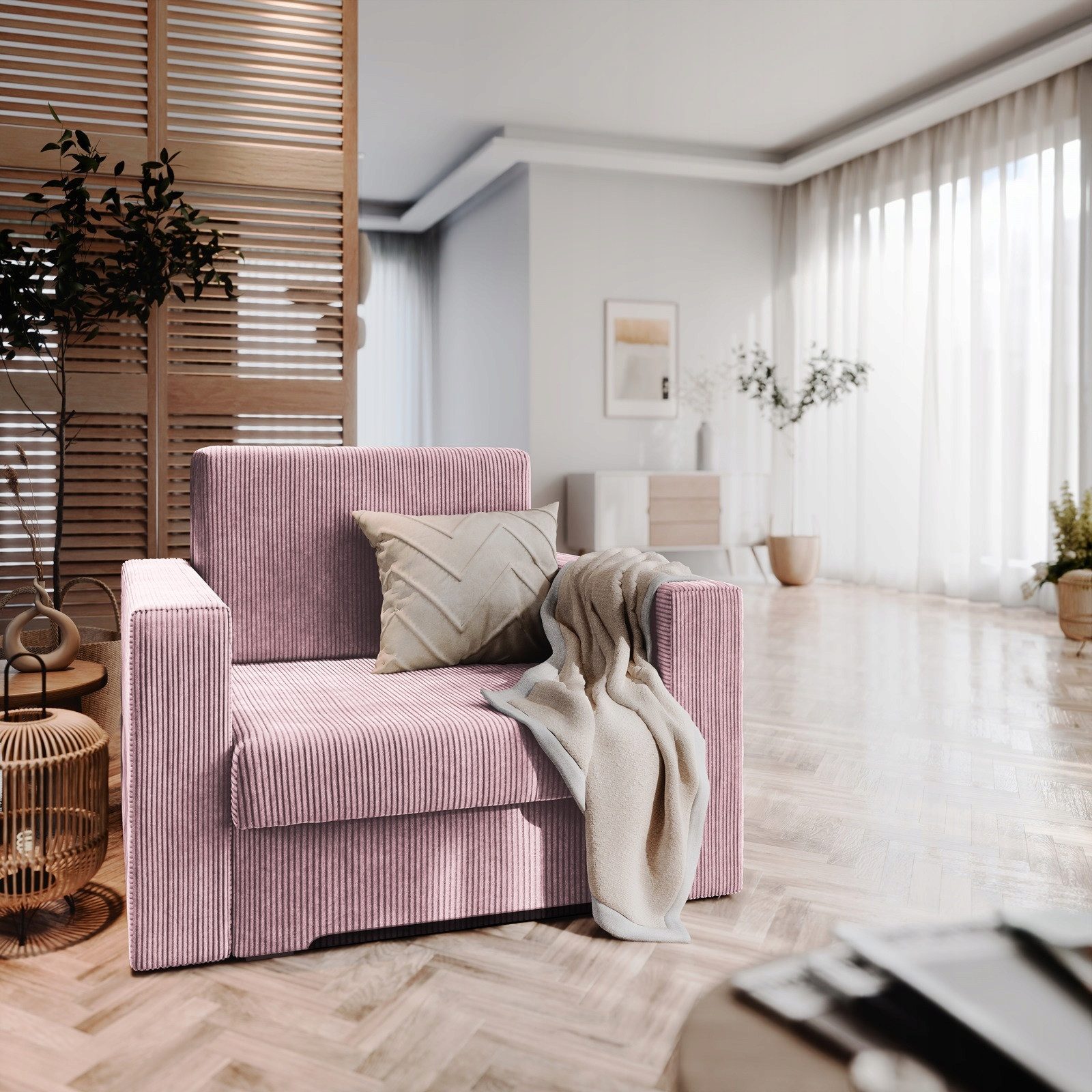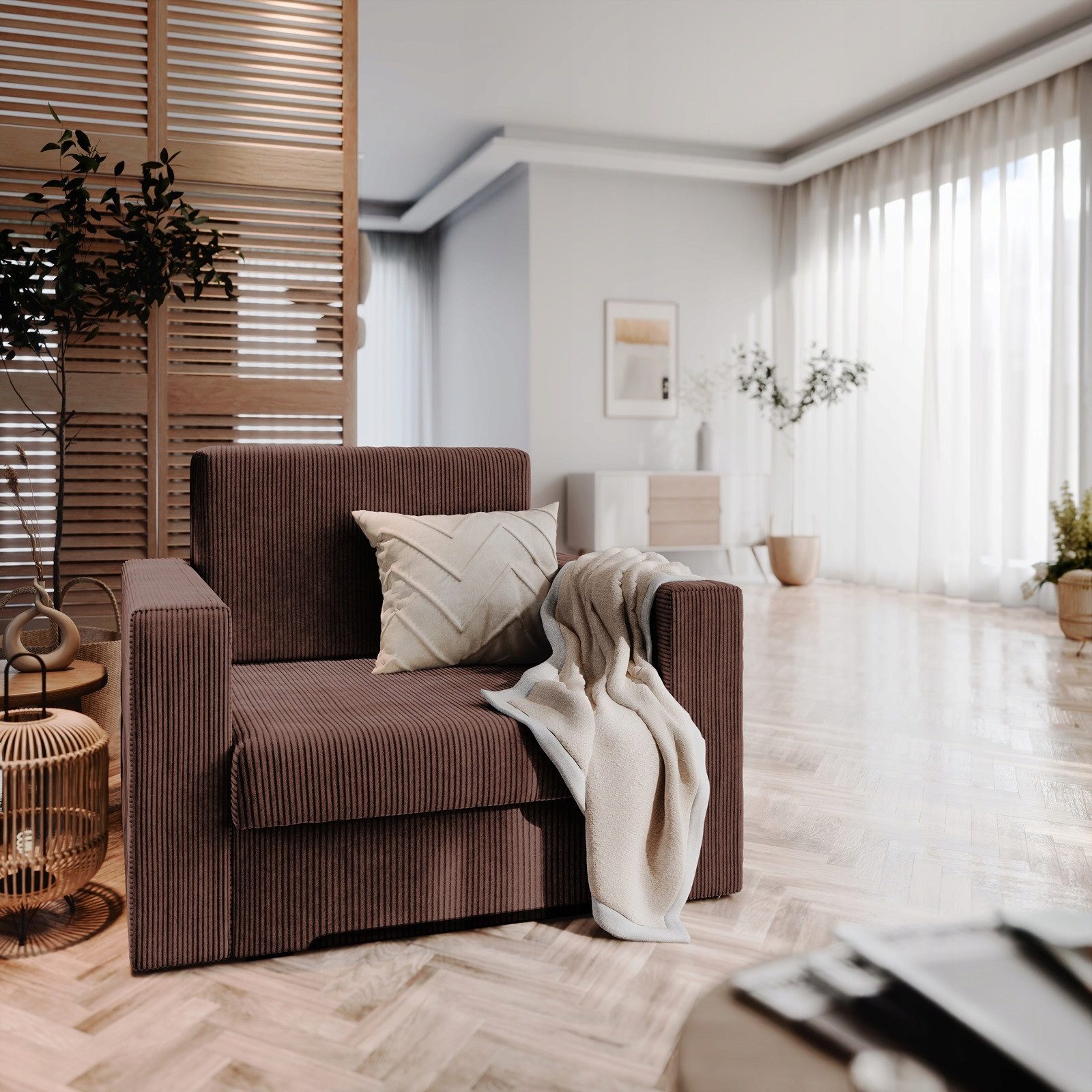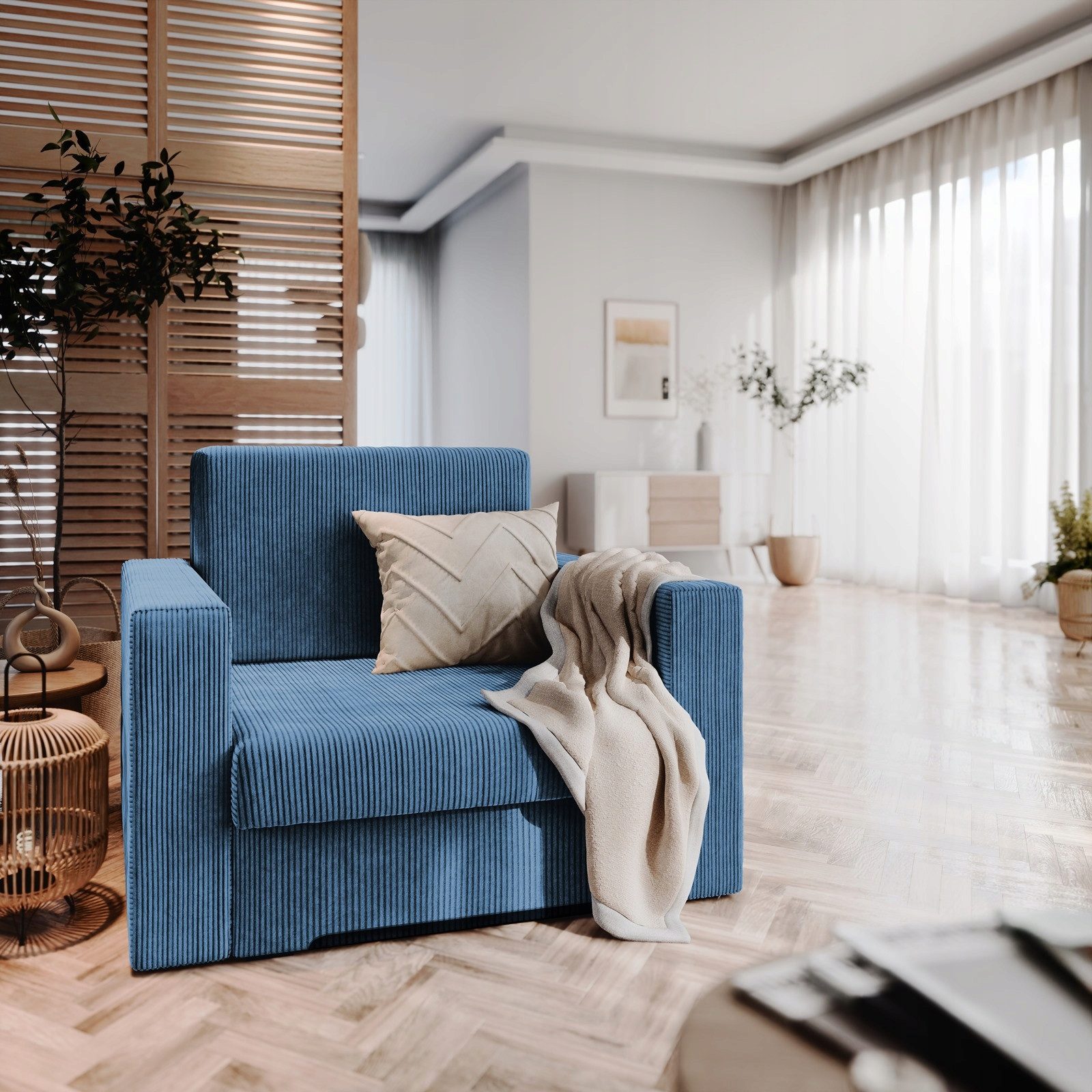 Der Sessel ist mit hochwertigem T30-Schaum gefüllt, der Elastizität, Komfort und Verformungsbeständigkeit garantiert. Zusätzliche Unterstützung bietet die verwendete Wellenfeder, die den Sitz nicht nur weich, sondern auch solide stützt. Die Polsterung besteht aus einem strapazierfähigen und angenehmen Stoff mit gerippter Struktur - ästhetisch ansprechend und pflegeleicht. Der Sessel verfügt über ein einfaches und bequemes Aufklappsystem, mit dem er sich schnell in ein Bett mit einer idealen Liegefläche für eine Person verwandeln lässt.