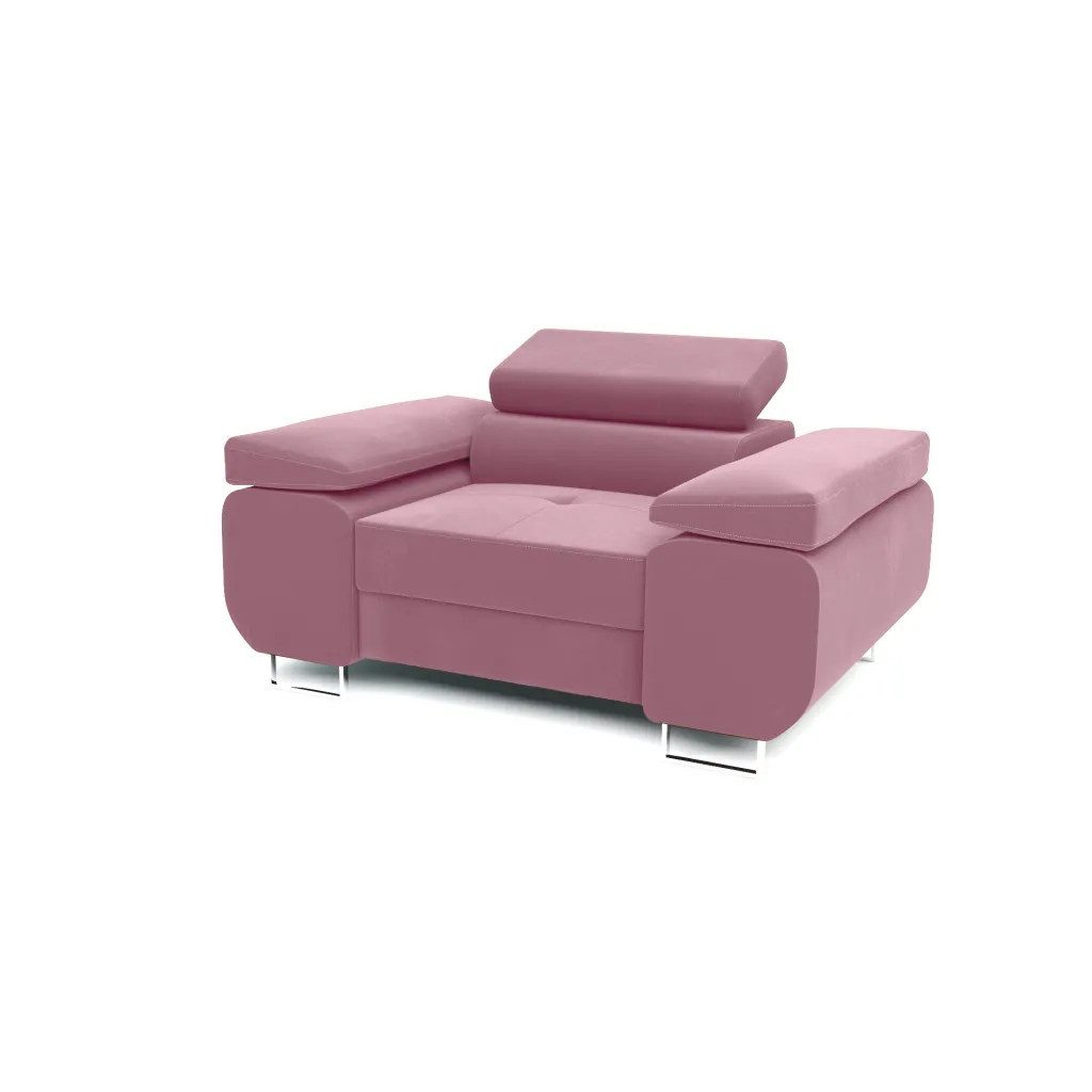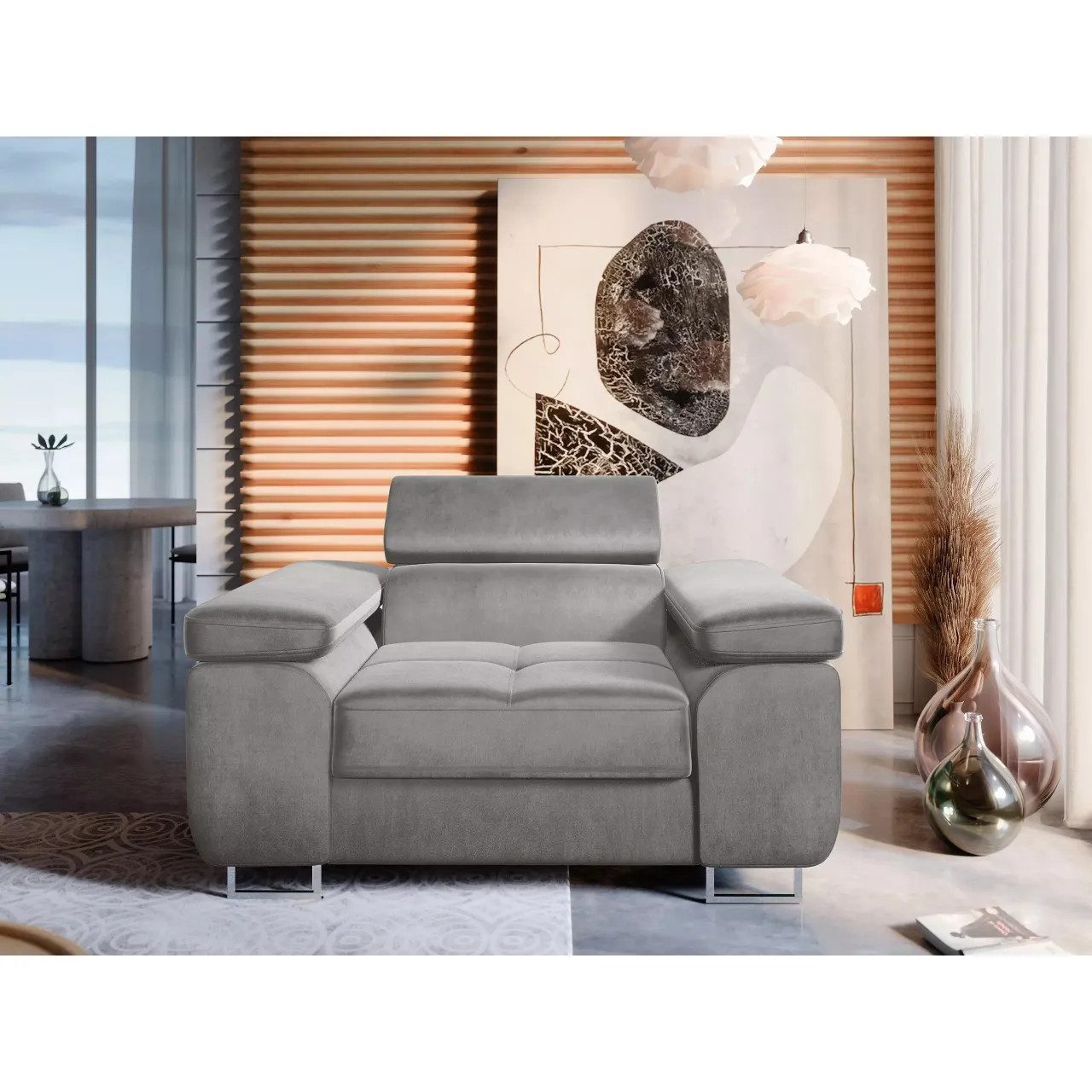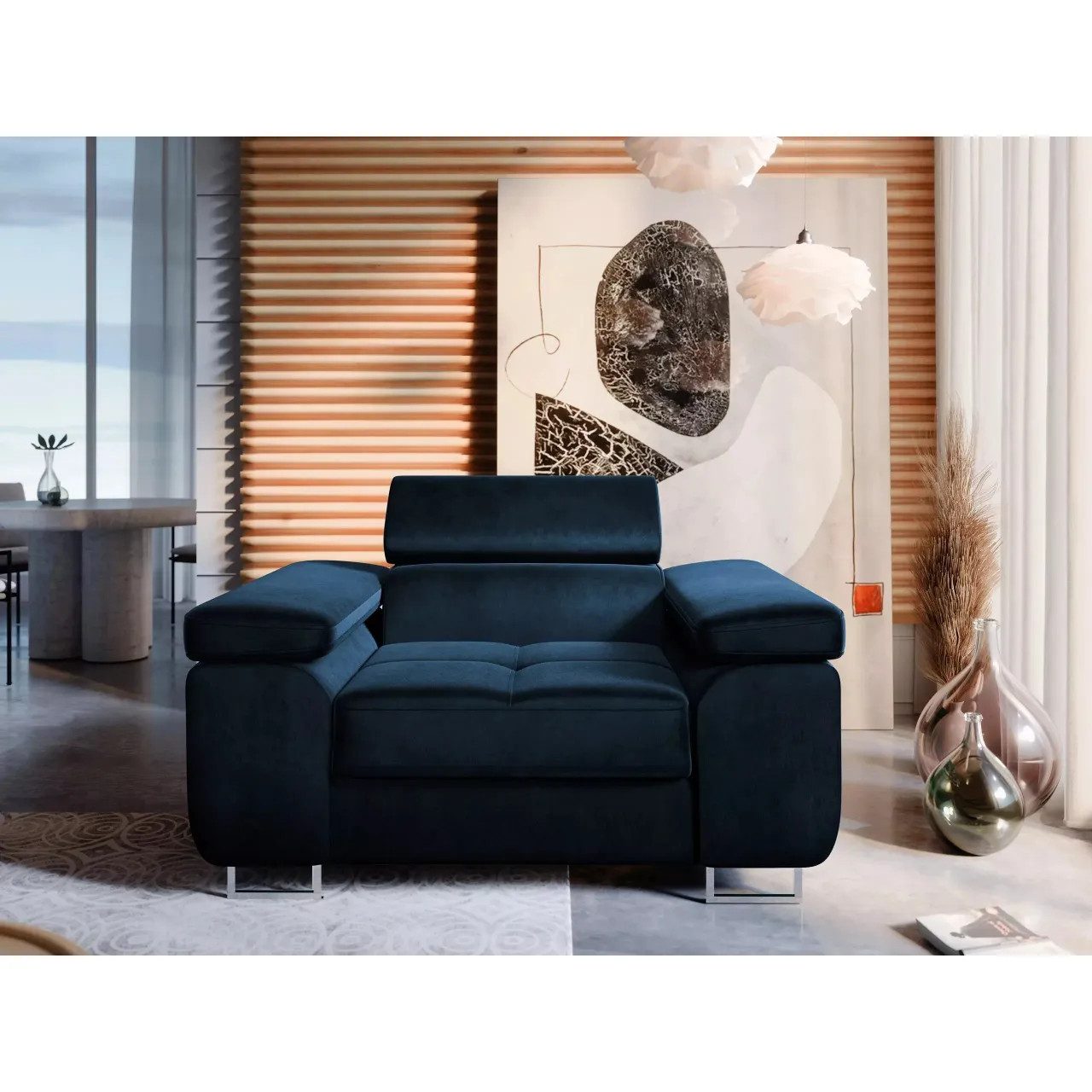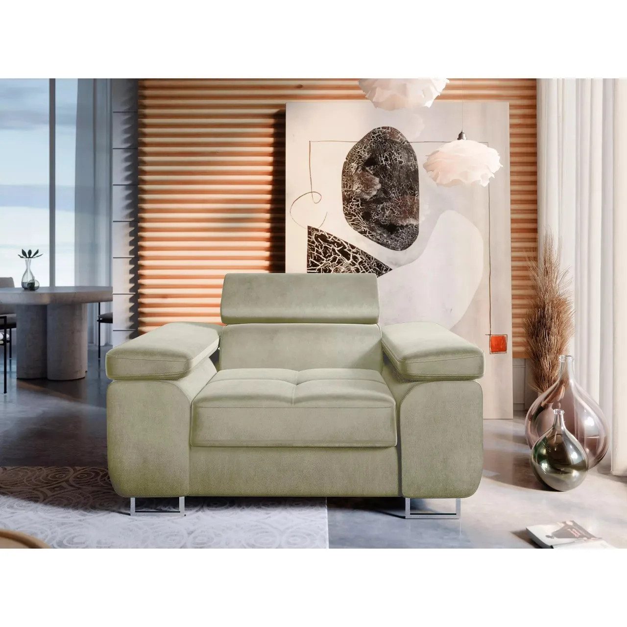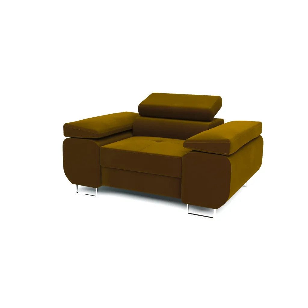 Der Sessel ist aus hochwertigen Materialien gefertigt, die Langlebigkeit und Komfort garantieren. Die Füllung ist eine Kombination aus gewellter Feder und T30-Schaum, dank derer der Sitz federnd und verformungsbeständig bleibt und den Körper perfekt stützt. Die Struktur basiert auf einem massiven Holzplattenrahmen, der die Stabilität und Langlebigkeit des Möbelstücks gewährleistet. Ein weiterer Vorteil ist die verstellbare Kopfstütze, mit der Sie die Höhe der Stütze für Kopf und Nacken individuell einstellen können. Das Ganze ruht auf modernen Metallbeinen, die für Leichtigkeit sorgen und den zeitgenössischen Stil des Sessels unterstreichen.