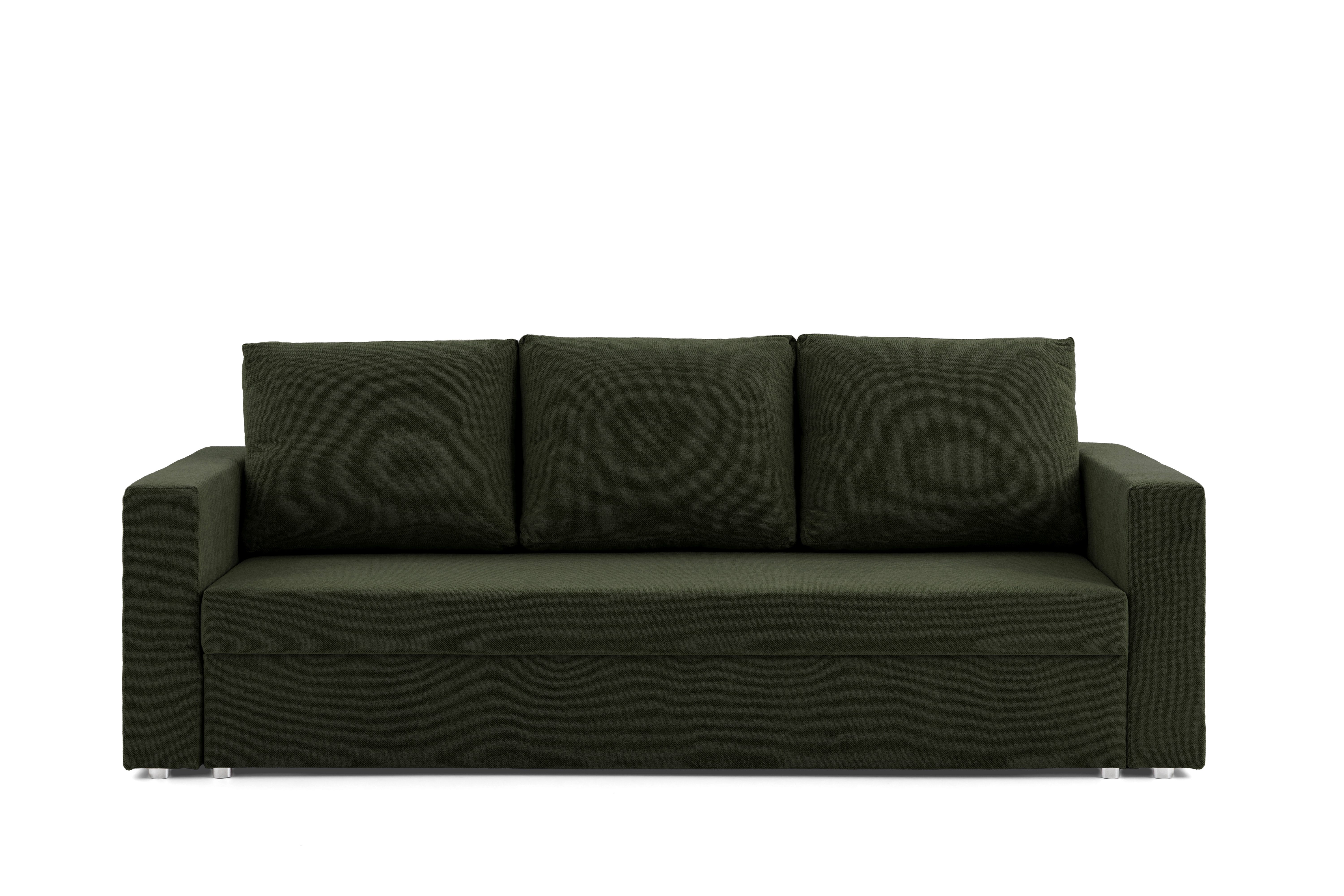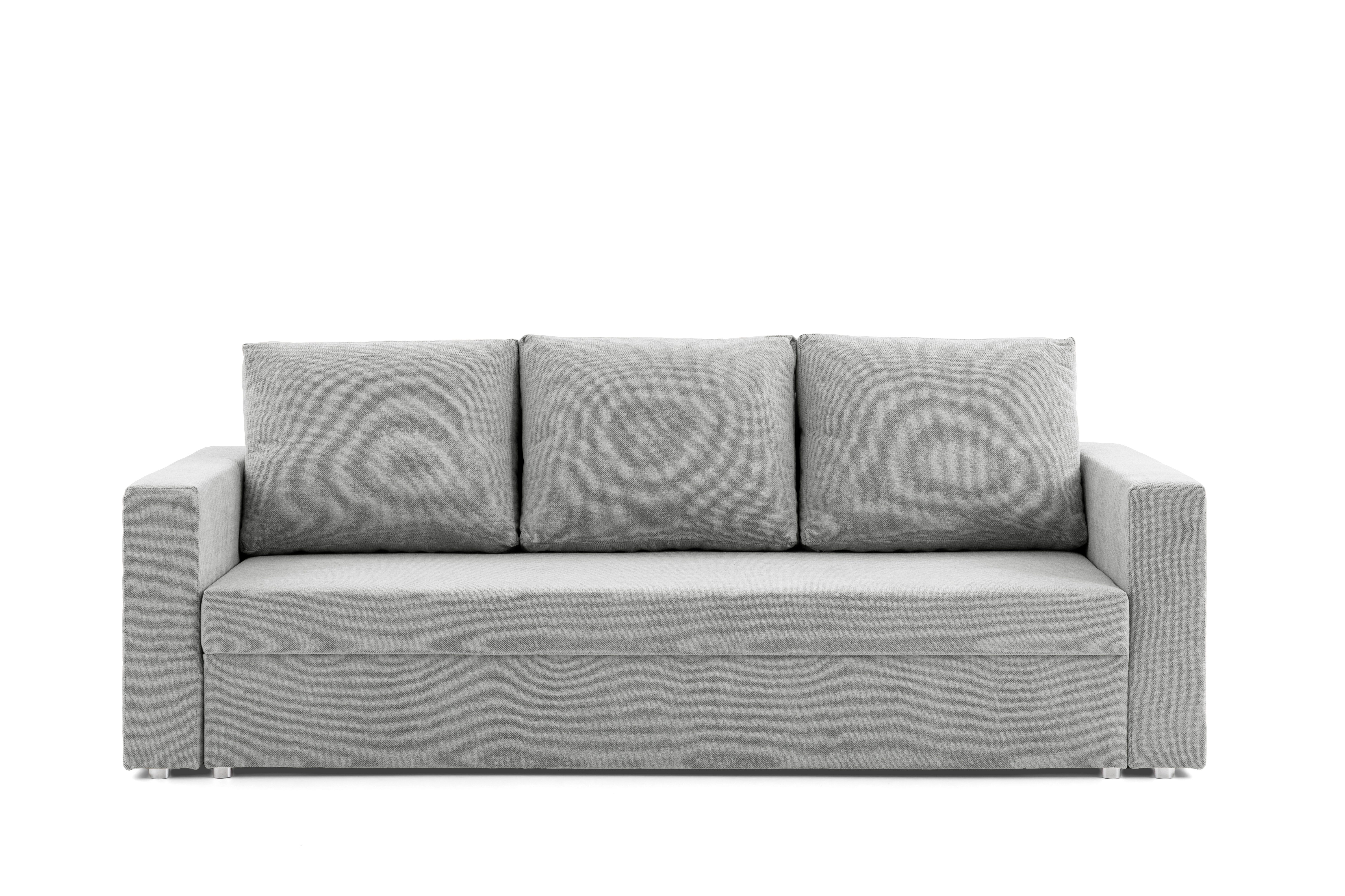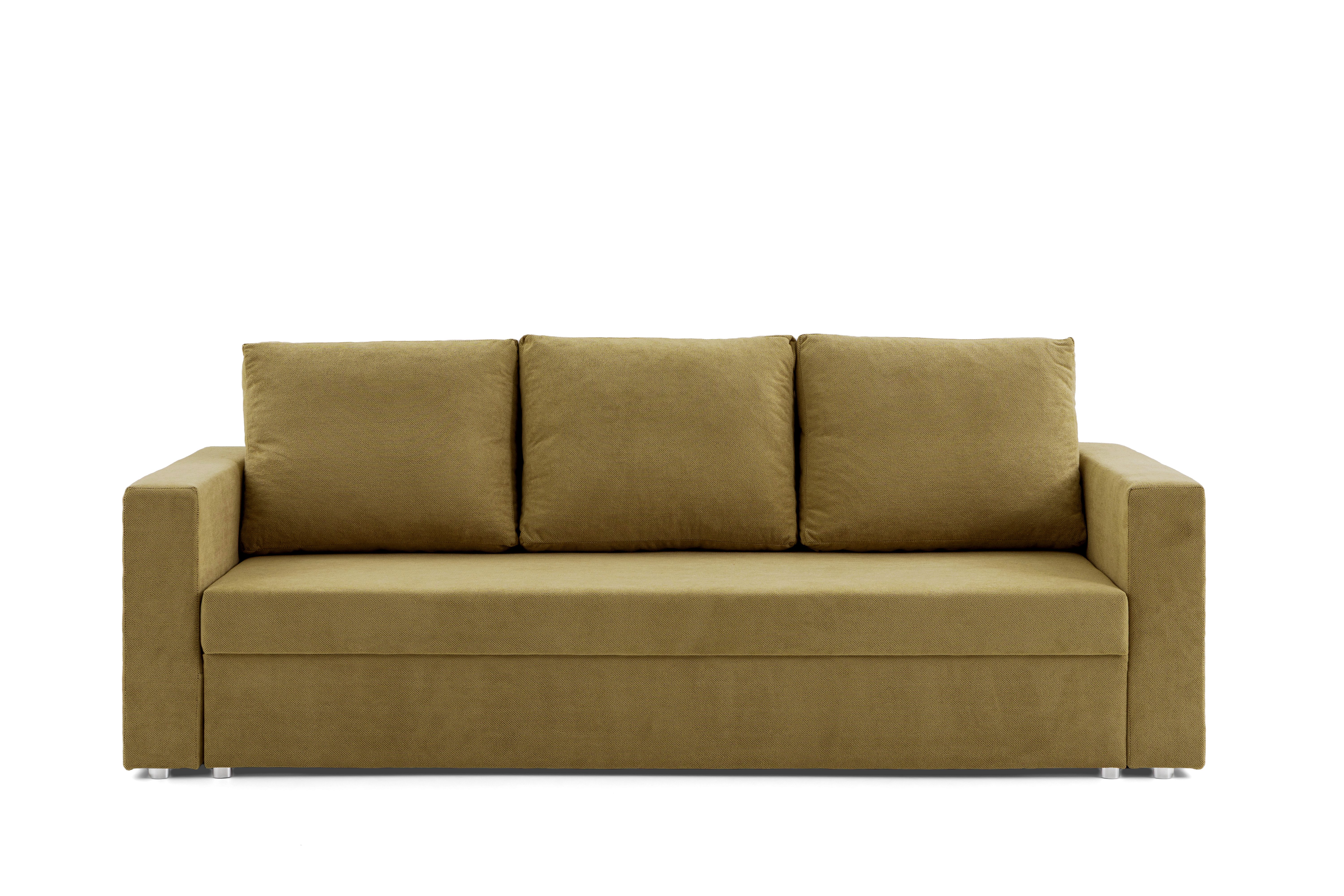 Die Füllung der Sitz- und Liegefläche besteht aus hochwertigem T30-Schaumstoff, der für seine hohe Verformungsbeständigkeit bekannt ist und der Wirbelsäule eine angemessene Unterstützung bietet. Die Verwendung einer gewellten Feder erhöht den Komfort zusätzlich und garantiert Federung und Haltbarkeit über viele Jahre. Das Sofa ist mit einem einfachen und zuverlässigen Klappmechanismus ausgestattet, mit dem es sich schnell in ein bequemes Bett verwandeln lässt. Der praktische Bettzeugbehälter, der unter der Sitzfläche versteckt ist, ist ein zusätzlicher Pluspunkt. .