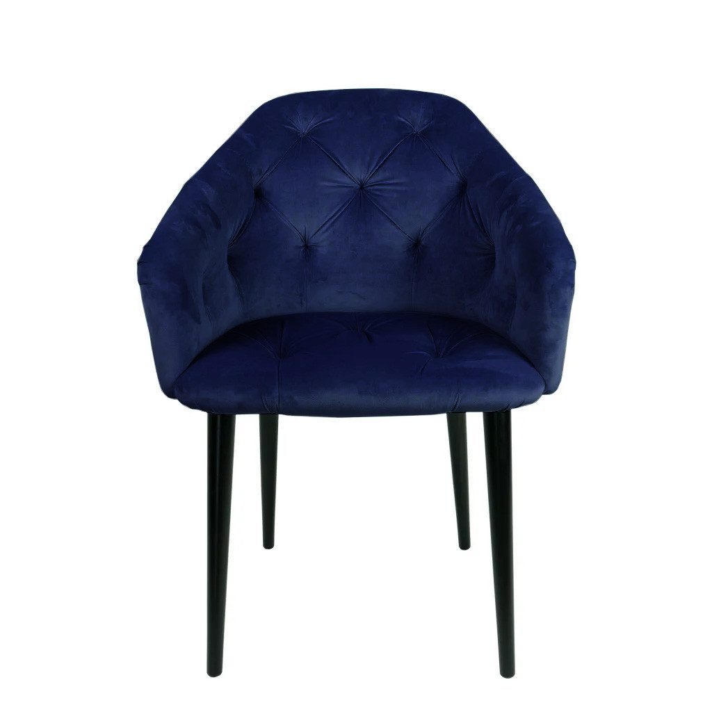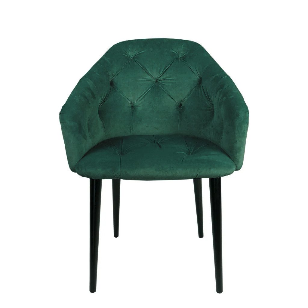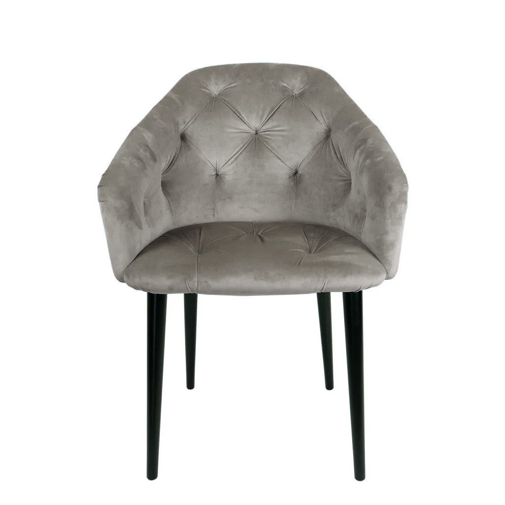 Der gepolsterte Stuhl im Stil der modernen Klassiker ist eine Kombination aus Eleganz, Komfort und solider Verarbeitung. Die abgerundete Rückenlehne mit einem fließenden Übergang in die Armlehnen schafft eine gemütliche Form des Stuhls und sorgt für einen angenehmen Sitzkomfort und eine stabile Abstützung von Rücken und Armen. Dekorative Steppungen in Form von Knöpfen verleihen dem Möbelstück einen stilvollen, dezent glamourösen Charakter, ideal für Esszimmer, Wohnzimmer und gewerbliche Einrichtungen wie Restaurants oder Büros..