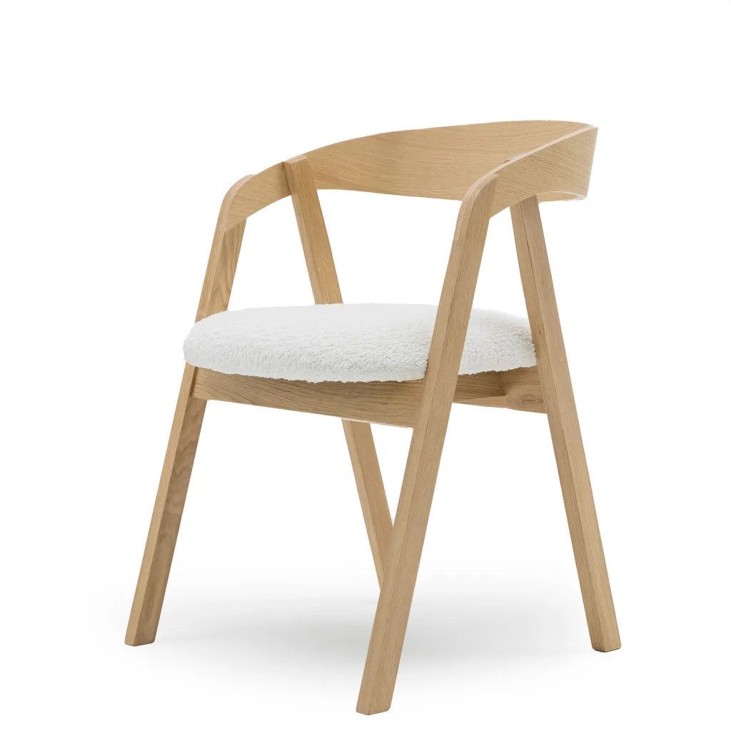 Der Stuhl ZEN ist eine Kombination aus natürlichen Materialien und moderner Form. Seine leichte, aber robuste Konstruktion eignet sich perfekt für Wohn- und Geschäftsräume - vom Esszimmer über das Wohnzimmer bis hin zum Büro oder Café. Das helle Eichenholz und der weiche, elfenbeinfarbene Bouclé-Stoff verleihen ihm eine zeitlose, dezent elegante Ausstrahlung. Die filigranen Armlehnen und die ergonomisch geformte Rückenlehne sorgen für bequemen Sitzkomfort, während die universelle Form zum skandinavischen, japanischen oder Boho-Stil passt.