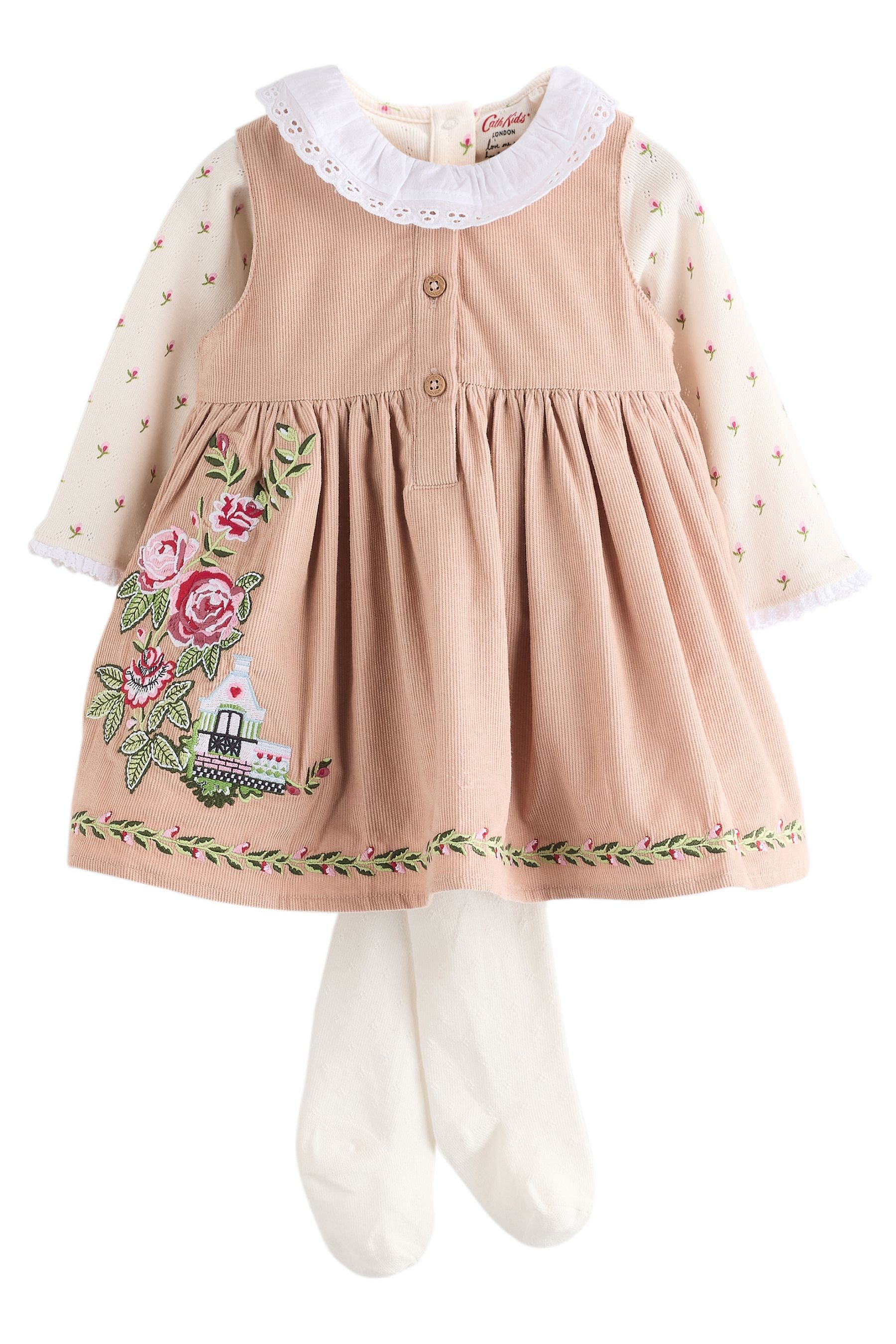 Materialzusammensetzung | Latzkleid: 100 % Baumwolle. Body: 100 % Baumwolle. Strumpfhose: 76 % Baumwolle, 22 % Polyamid, 2 % Elasthan. |