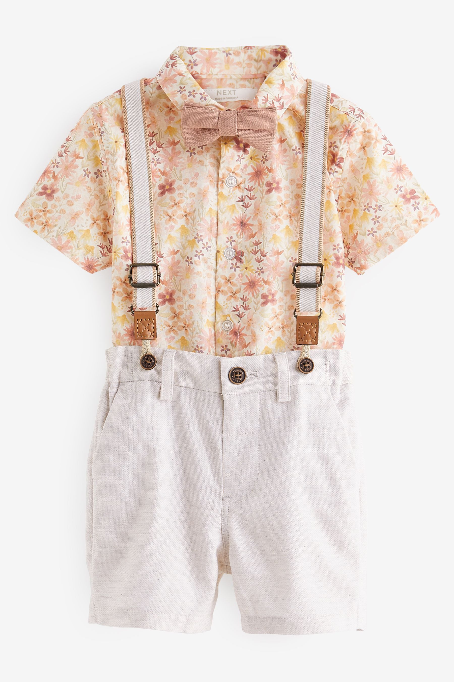 Materialzusammensetzung | Hemd: 100 % Baumwolle. Shorts: 100% Baumwolle. Fliege: 69 % Polyester, 29 % Viskose, 2 % Elasthan. Hosenträger: 90 % Polyester, 10 % Elasthan. |
