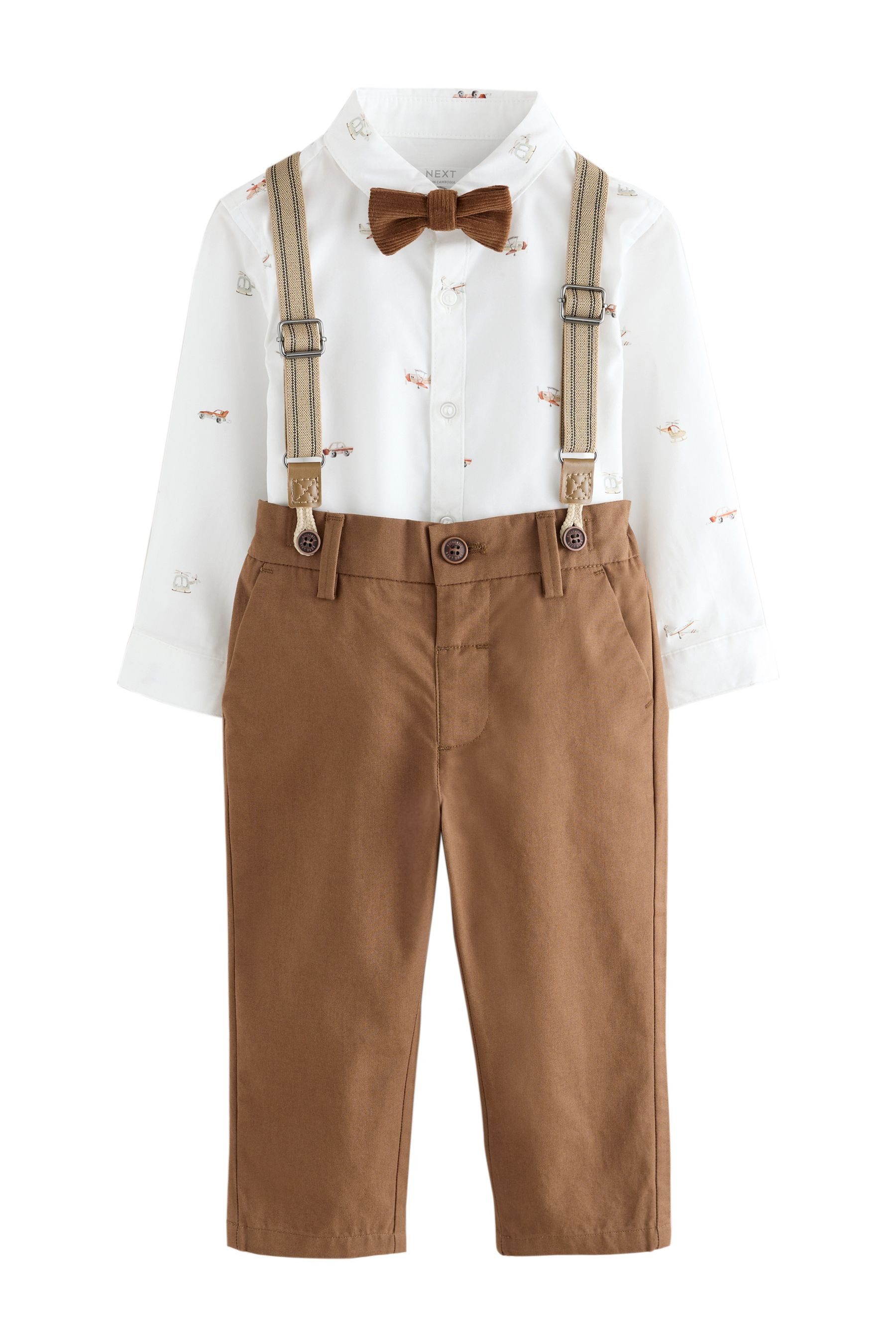 Materialzusammensetzung | Hemd: 100 % Baumwolle. Hose: 100 % Baumwolle. Fliege: 98 % Baumwolle, 2 % Elasthan. Hosenträger: 72 % Polyester, 28 % Elasthan. |