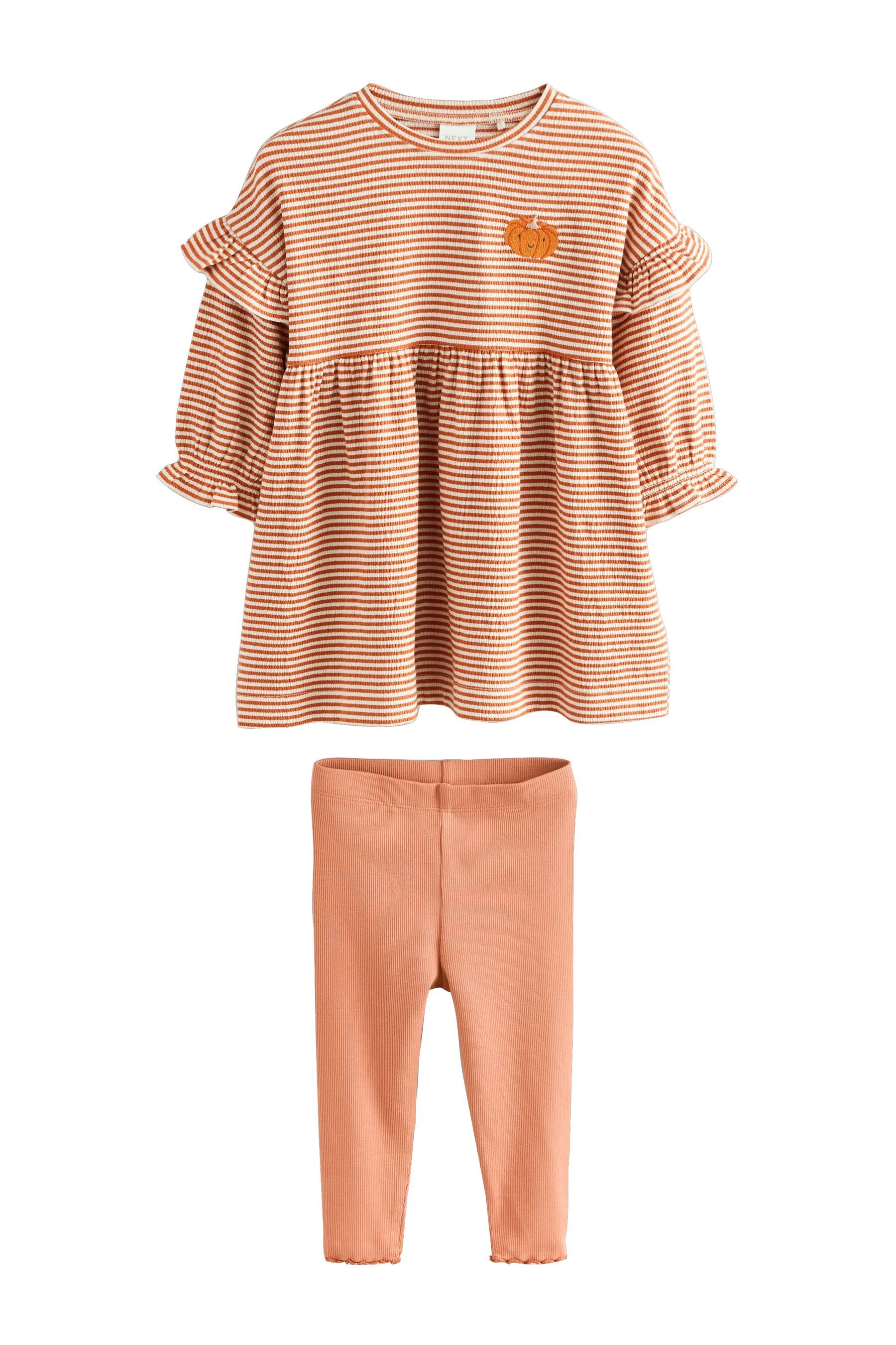 Materialzusammensetzung | Kleid: 95 % Baumwolle, 5 % Elasthan. Leggings: 92 % Baumwolle, 8 % Elasthan. |