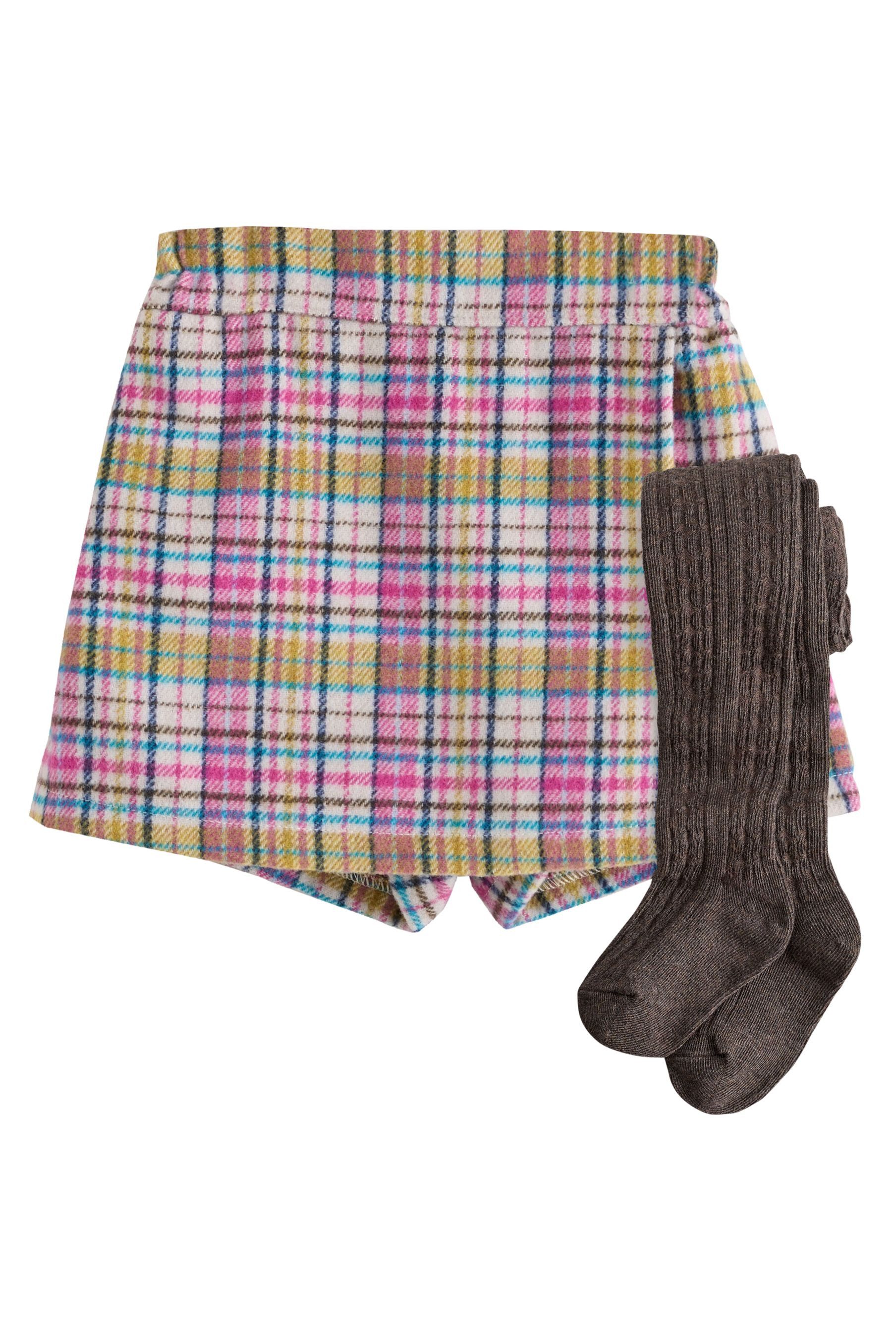 Materialzusammensetzung | Rock: 84 % Polyester, 13 % Wolle, 1 % Polyacryl, 1 % Polyamid, 1 % Viskose. Strumpfhose: 76 % Baumwolle, 21 % Polyamid, 3 % Elasthan. |