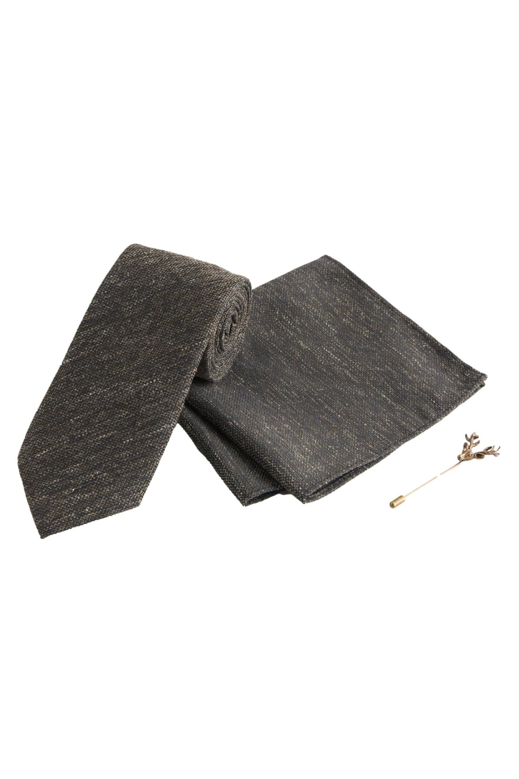 Materialzusammensetzung | Krawatte: 91 % Polyester, 9 % Leinen. Einstecktuch: 91 % Polyester, 9 % Leinen. Krawattenclip: 100 % Metall. |