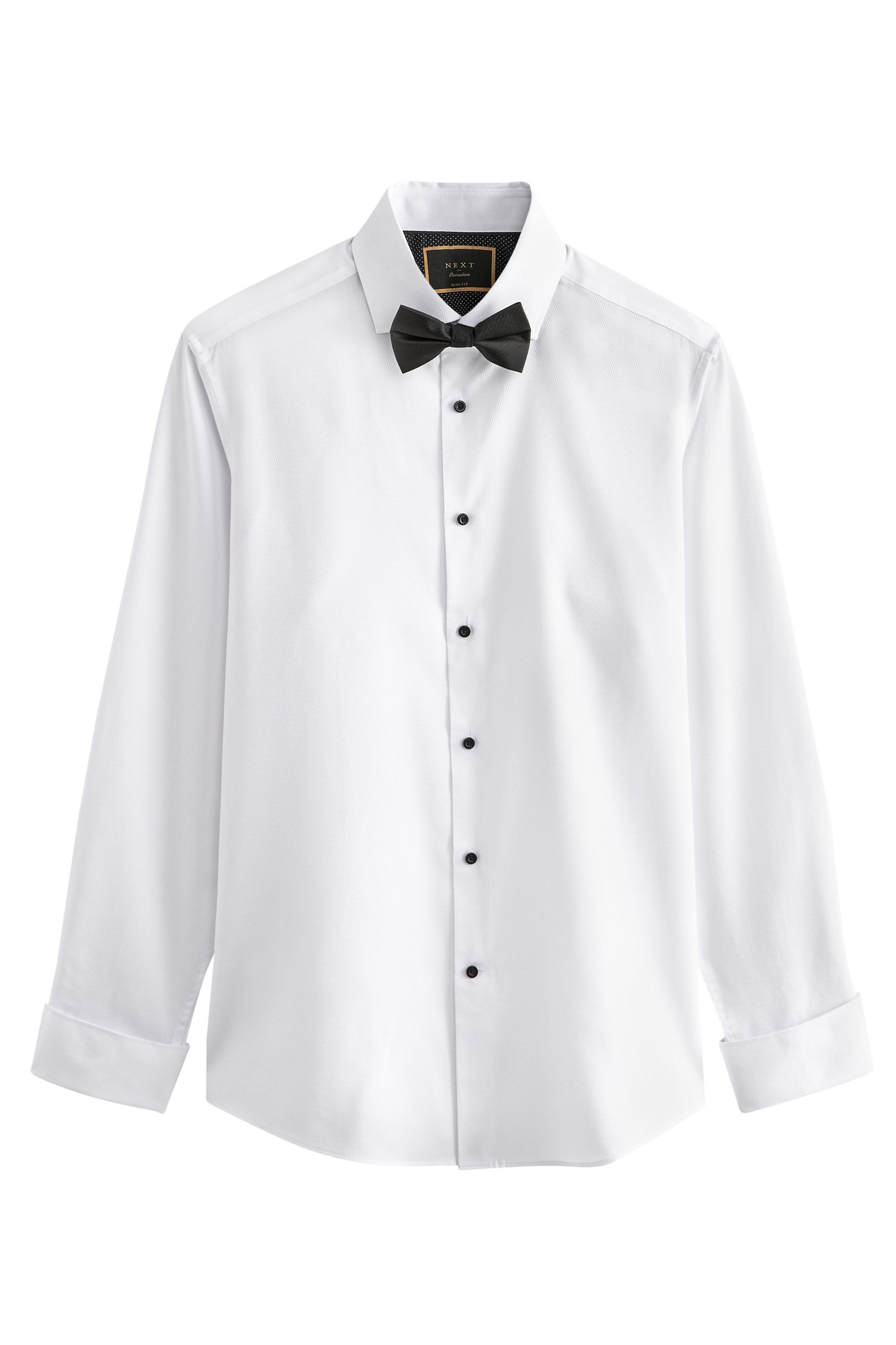Materialzusammensetzung | Hemd: 65 % Polyester (recycelt), 35 % Baumwolle. Fliege: 100 % Polyester (recycelt). |