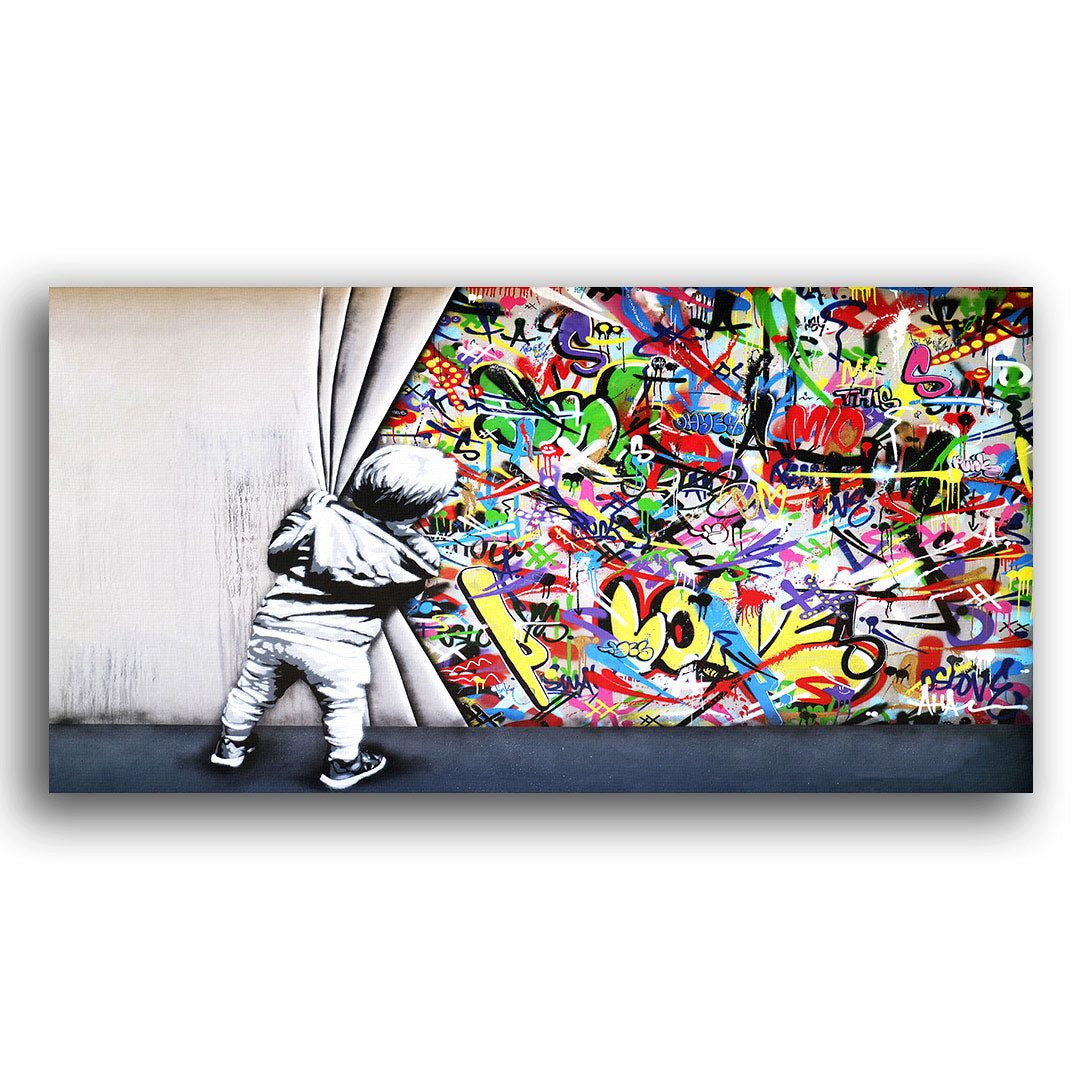 Hinter dem Vorhang – Wandbild auf Leinwand & Acrylglas Ein faszinierendes Kunstwerk, das Neugier und Kreativität weckt. Der Kontrast zwischen Schwarz-Weiß und lebendiger Graffiti-Kunst macht dieses Bild zu einem einzigartigen Blickfang. Ikonisches Design: Ein neugieriges Kind, das den Vorhang zu einer lebendigen Welt voller Farben und Graffiti öffnet – eine Einladung zur Entdeckung.Hochwertige Materialien: Erhältlich auf Leinwand oder Acrylglas für brillante Farben und eine beeindruckende Tiefenwirkung.Ein stilvolles Statement: Ideal für moderne Wohnräume, Büros oder Studios, um künstlerische Inspiration und Dynamik zu vermitteln. Deine Vorteile bei uns: Einzigartige Motive für dein Zuhause Made in Germany Montagefertig inkl. Aufhängeset Kein Risiko! 30 Tage Geld-zurück-Garantie