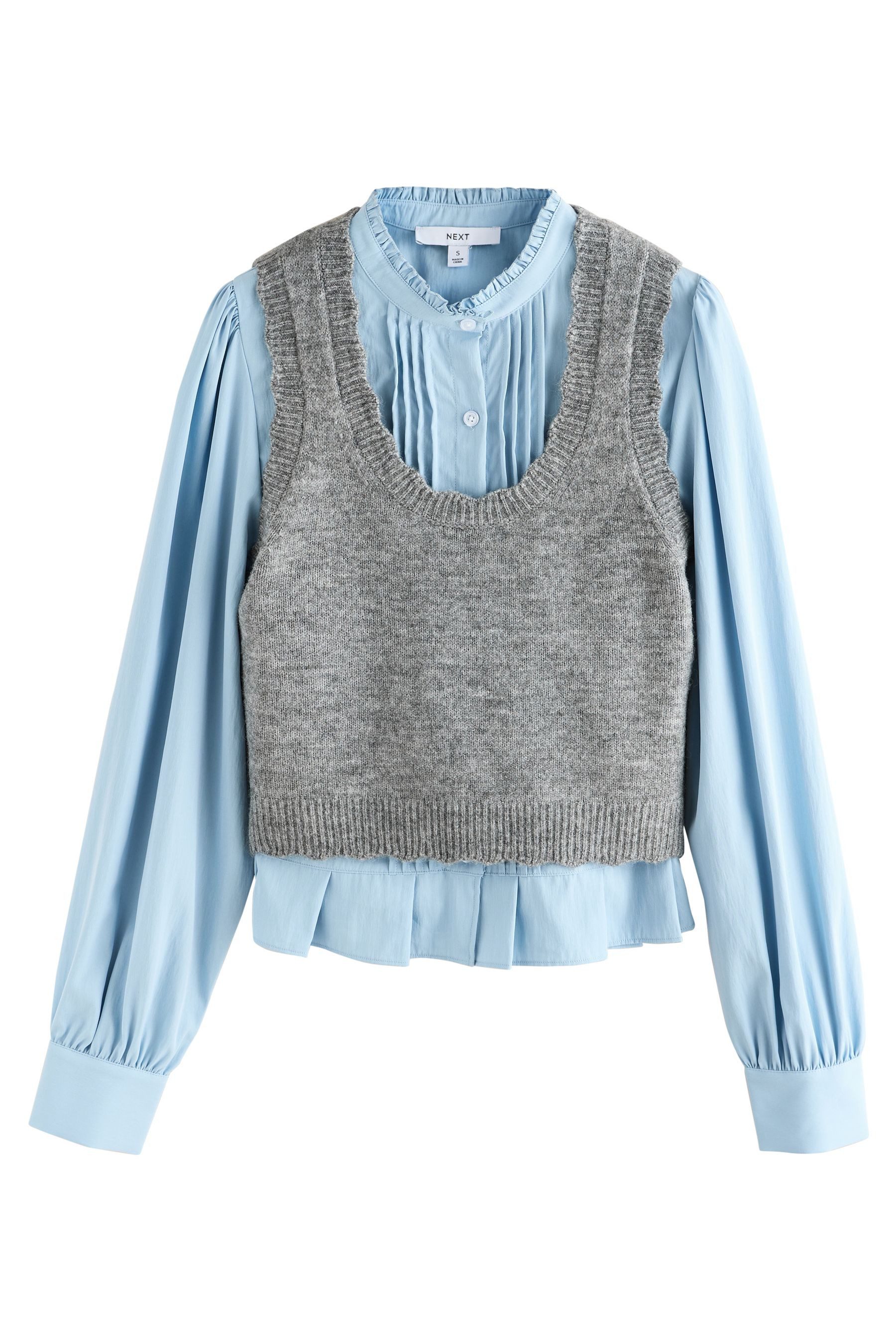 Materialzusammensetzung | Pullunder, Strick: 52 % Polyester (recycelt), 37 % Polyacryl, 8 % Wolle, 3 % Elasthan. Bluse, Webstoff: 70 % Polyester, 30 % Polyamid. |