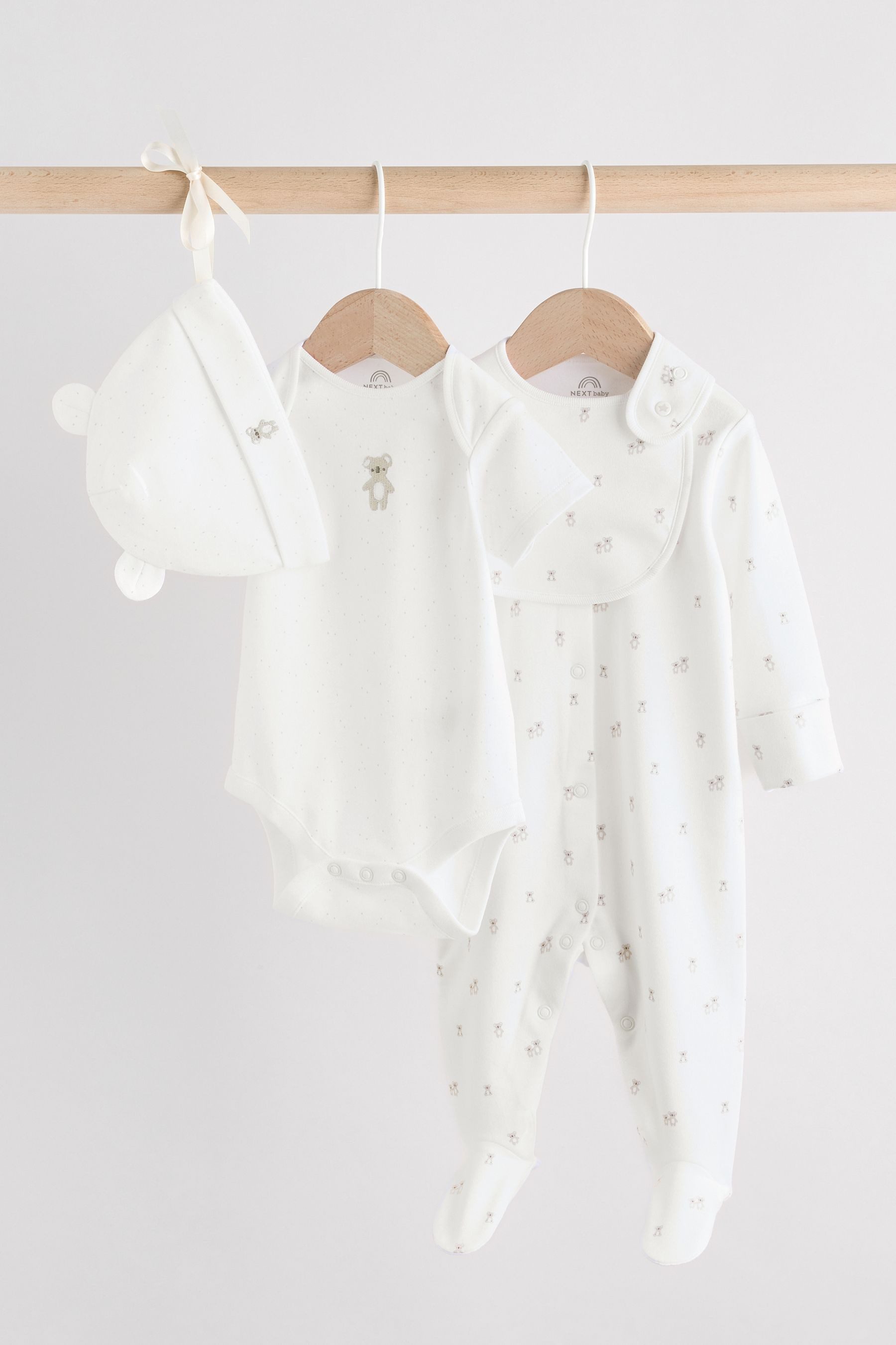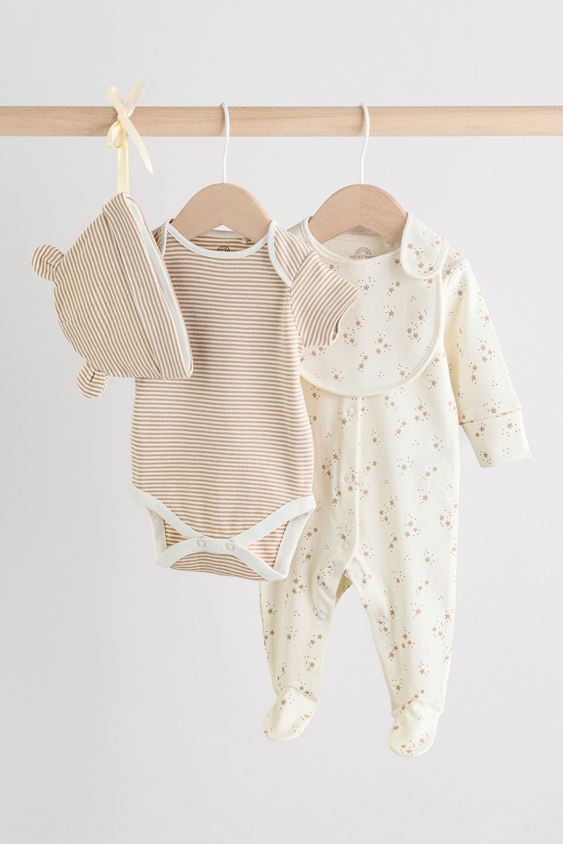 Materialzusammensetzung | Schlafanzug, Hauptmaterial: 100 % Baumwolle. Bodysuit, Hauptmaterial: 100 % Baumwolle. Lätzchen, Hauptmaterial: 100 % Baumwolle. Futter der Rückseite: 68 % Baumwolle, 19 % Polyester (recycelt), 13 % Polyurethan. Mütze, Hauptmaterial: 100 % Baumwolle. |
