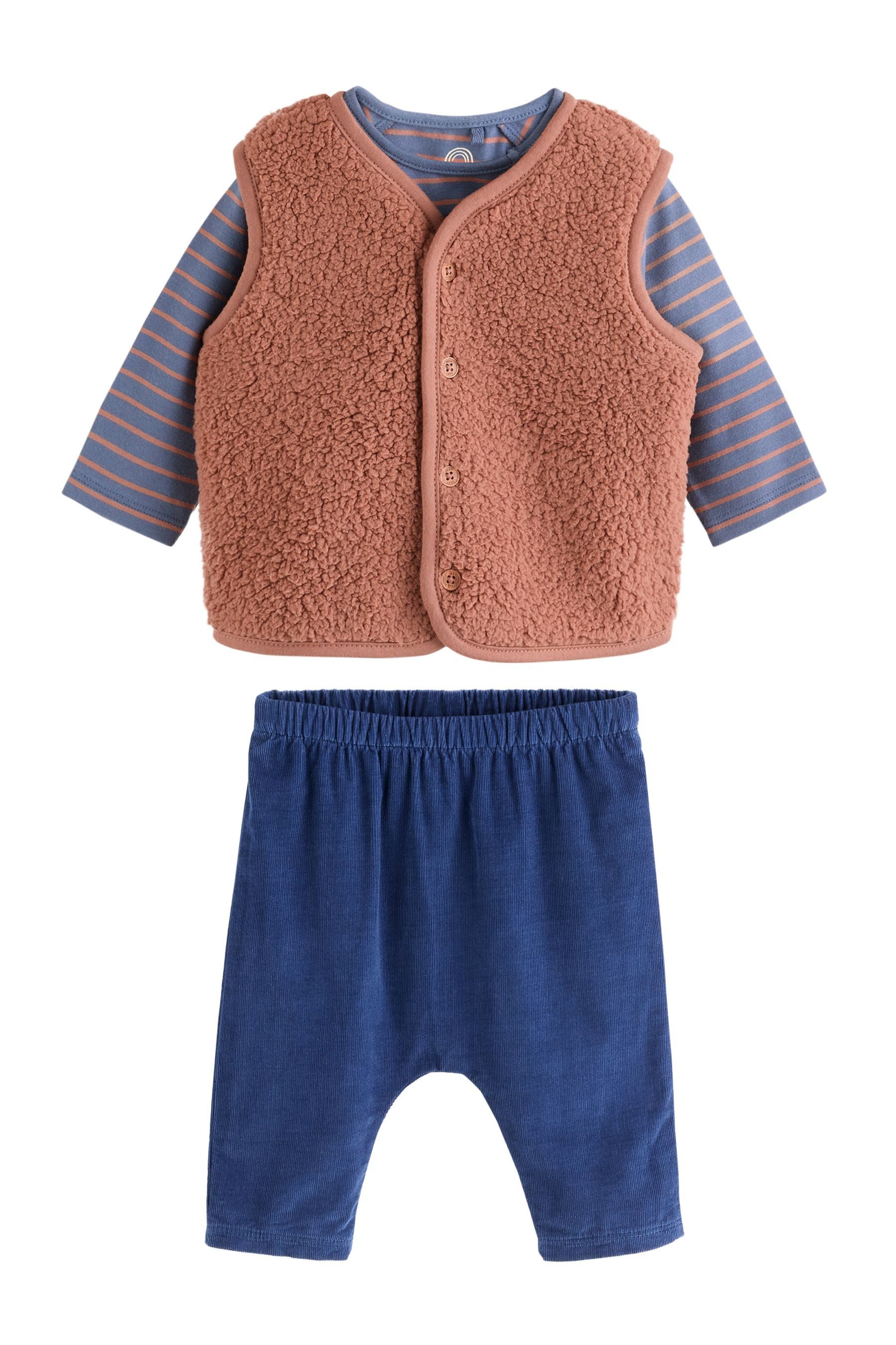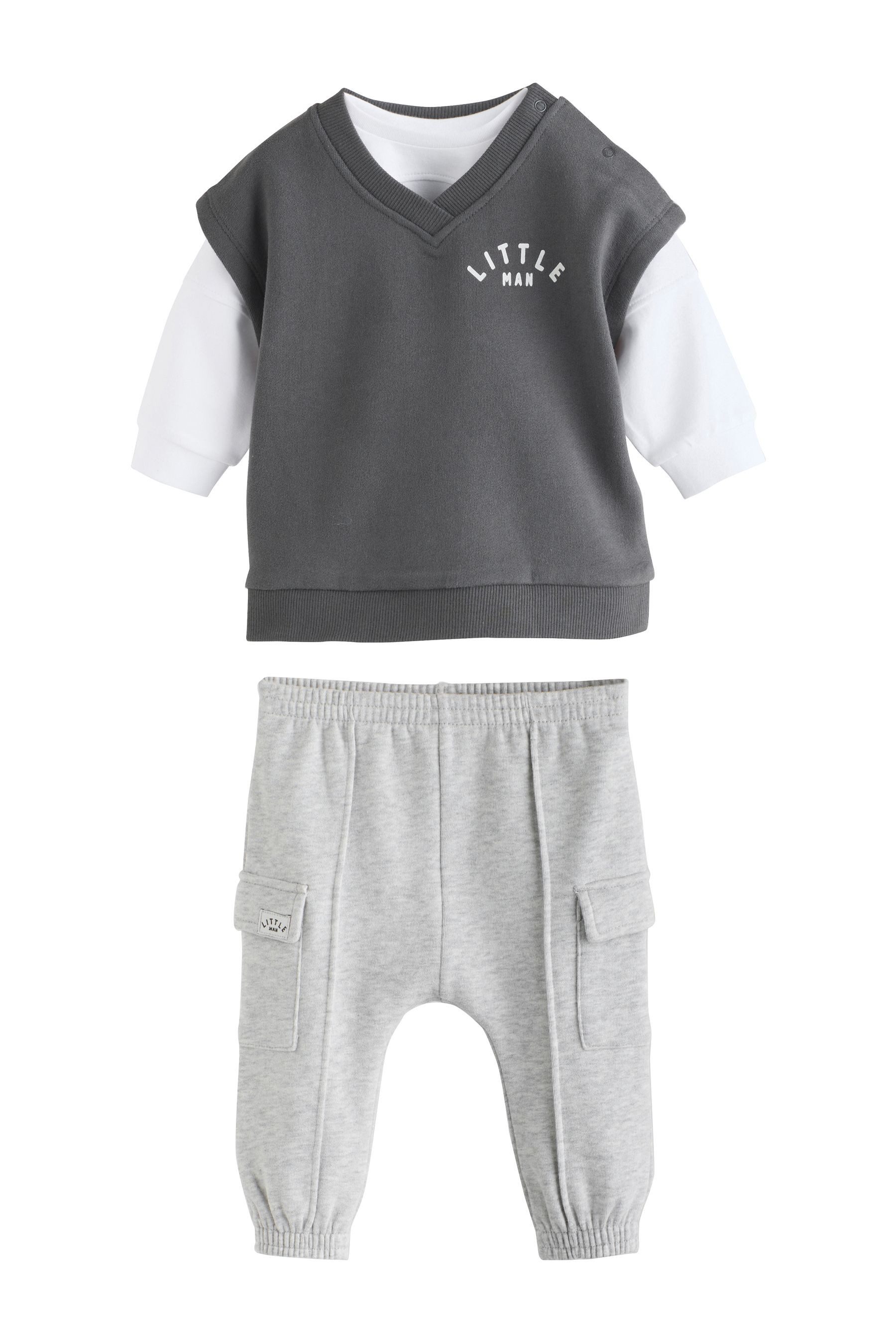 Materialzusammensetzung | Weste: 82% Baumwolle, 18% Polyester (recycelt)/ T-shirt: 95% Baumwolle, 5% Elasthan/ Jogginghose: 82% Baumwolle, 18% Polyester (recycelt) |