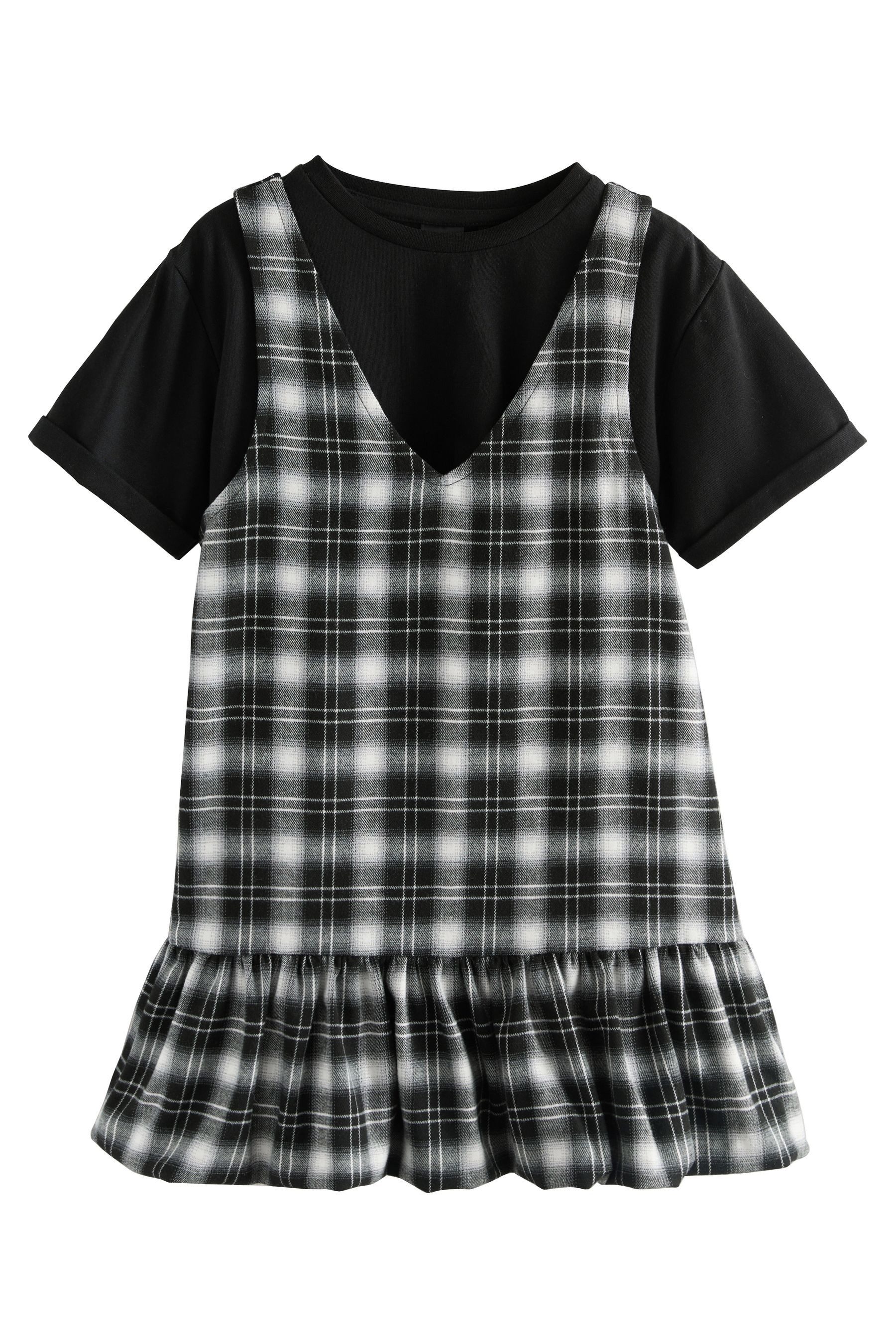 Materialzusammensetzung | Trägerkleid, Hauptmaterial: 78 % Polyester (recycelt), 21 % Viskose, 1 % Elasthan. Futter: 100 % Polyester. T-Shirt, Hauptmaterial: 100 % Baumwolle. |