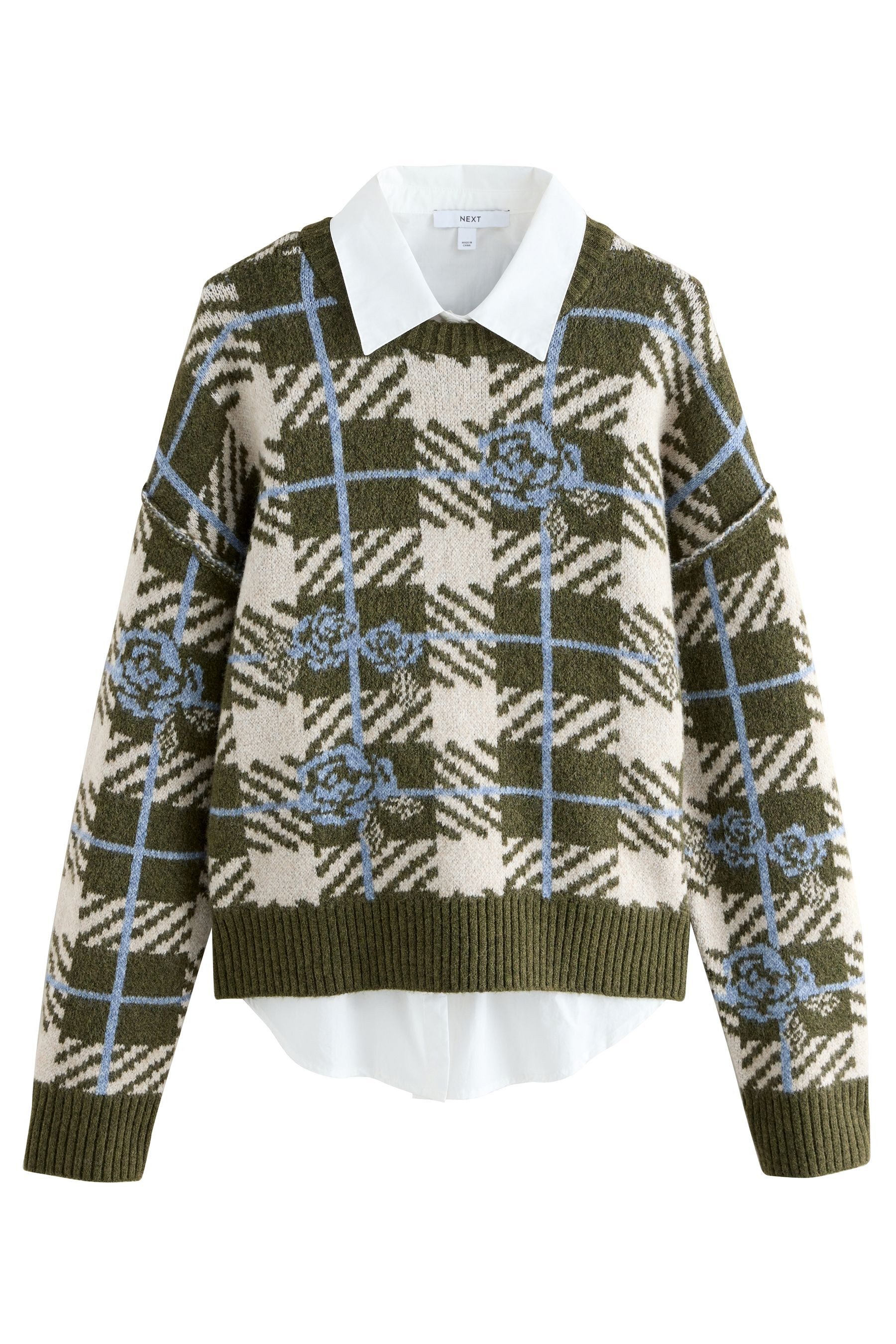 Materialzusammensetzung | Pullover: 52 % Polyester (recycelt), 37 % Polyacryl, 8 % Wolle, 3 % Elasthan. Bluse: 100 % Baumwolle. |