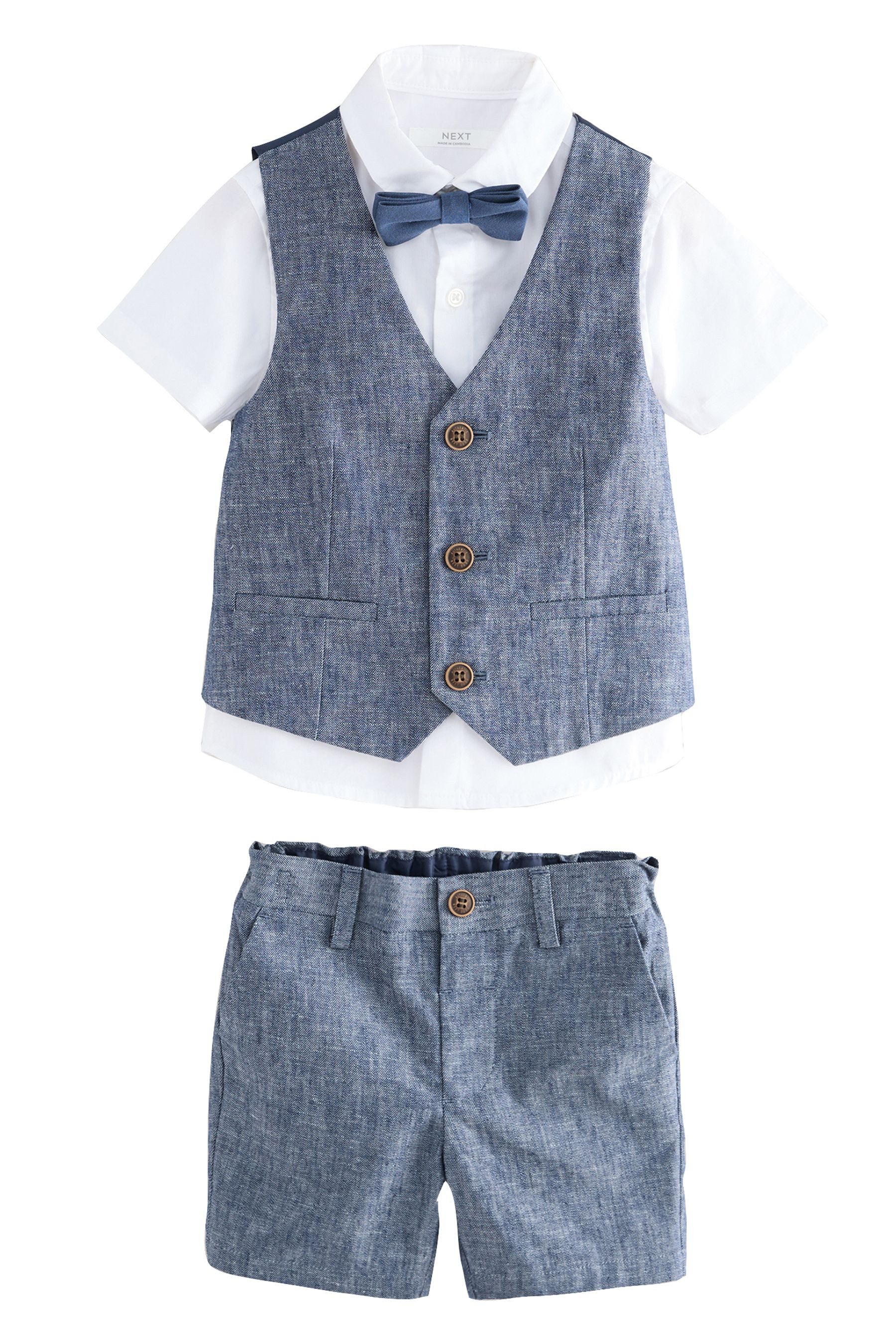 Materialzusammensetzung | Weste, Hauptmaterial: 61 % Baumwolle, 39 % Leinen. Futter: 100 % Polyester. Hemd: 100 % Baumwolle. Shorts: 61 % Baumwolle, 39 % Leinen. Fliege: 56 % Baumwolle, 44 % Polyester. |