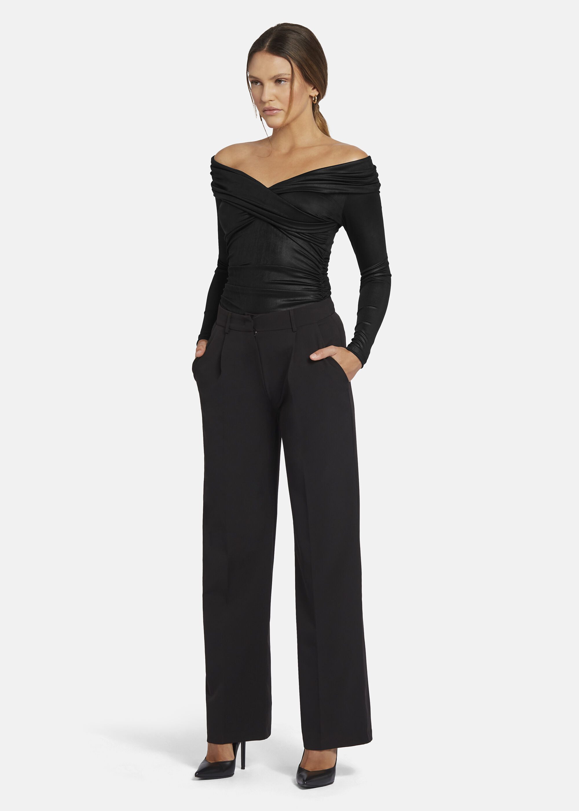 Der geraffte Body aus Metallic-Jersey FIOLINO hat einen Bardot-Ausschnitt und eine figurschmeichelnde Passform. Das elastische Jersey mit Metallic-Effekt setzt ausdrucksstarke Akzente zu jedem Look. Kombinieren Sie dazu unsere Bundfaltenhose VINIWA für einen besonderen Auftritt. Das Model ist 1,78 cm und trägt Размер 34.