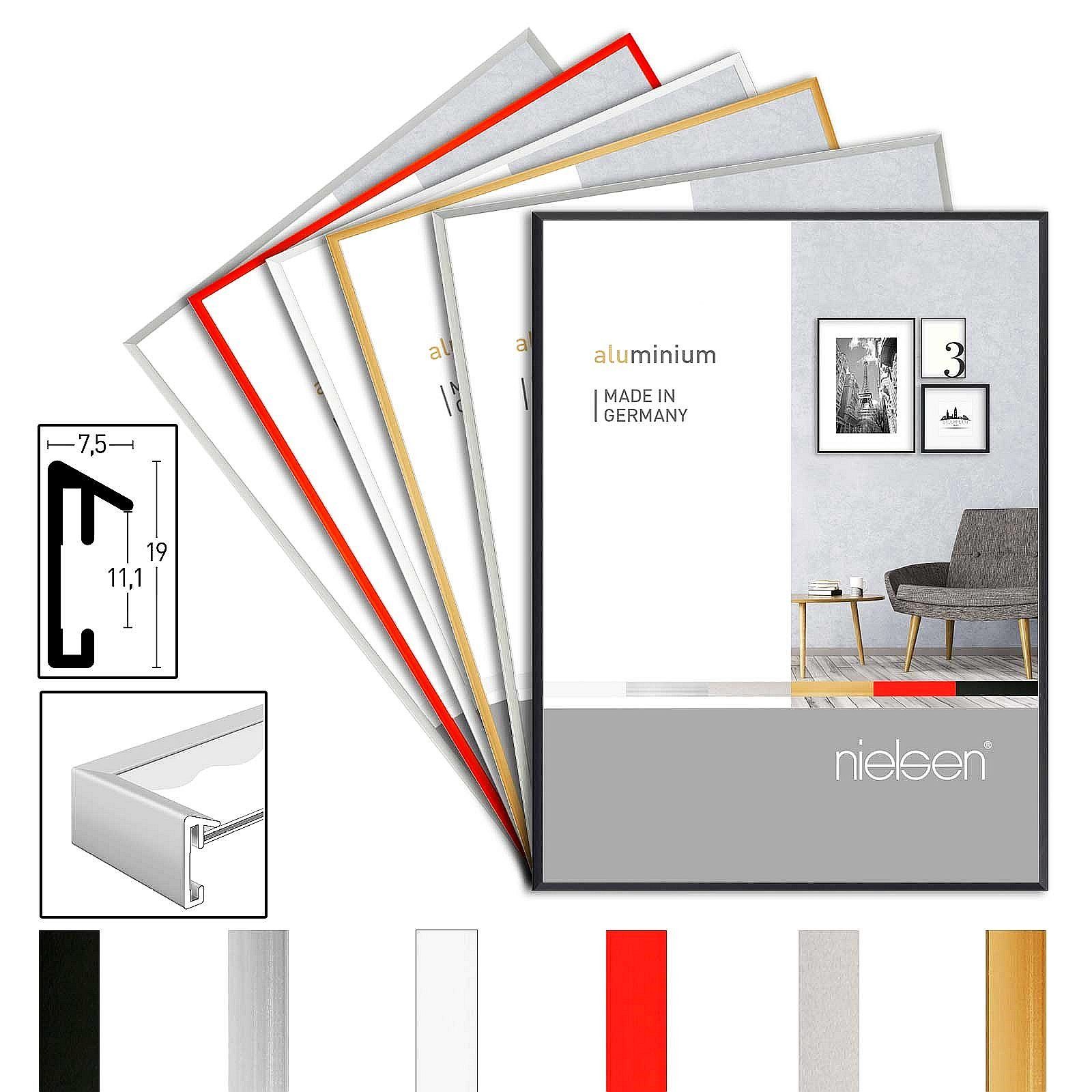 Aluminiumrahmen Pixel verschiedene Farben und Größen. Der Aluminiumrahmen Pixel ist ein schlichter, eleganter Bilderrahmen mit einer außergewöhnlich schmalen Leiste. Sie ist leicht geneigt und lässt sich für viele Einrahmungen hervorragend einsetzen. Das Profil ist 7,5 mm breit und 19 mm hoch. Durch das schmale, nach innen abfallende Profil ist der Alurahmen besonders für Fotografien und Poster geeignet. Der Aluminiumrahmen Pixel ist mit in den 6 Farben: gold glanz, silber glanz, silber matt, schwarz matt, weiß glanz und rot erhältlich. Er ist mit kantengeschliffenen Premiumglas ausgestattet. Die maximale Einlegehöhe beträgt ca. 2 mm. Bis zu einem Format von 18x24 cm ist der Rahmen mit einer schwarzen Rückwand und Aufsteller für Hoch- und Querformat versehen. Все Rahmen kann man im Hoch- und Querformat aufhängen.