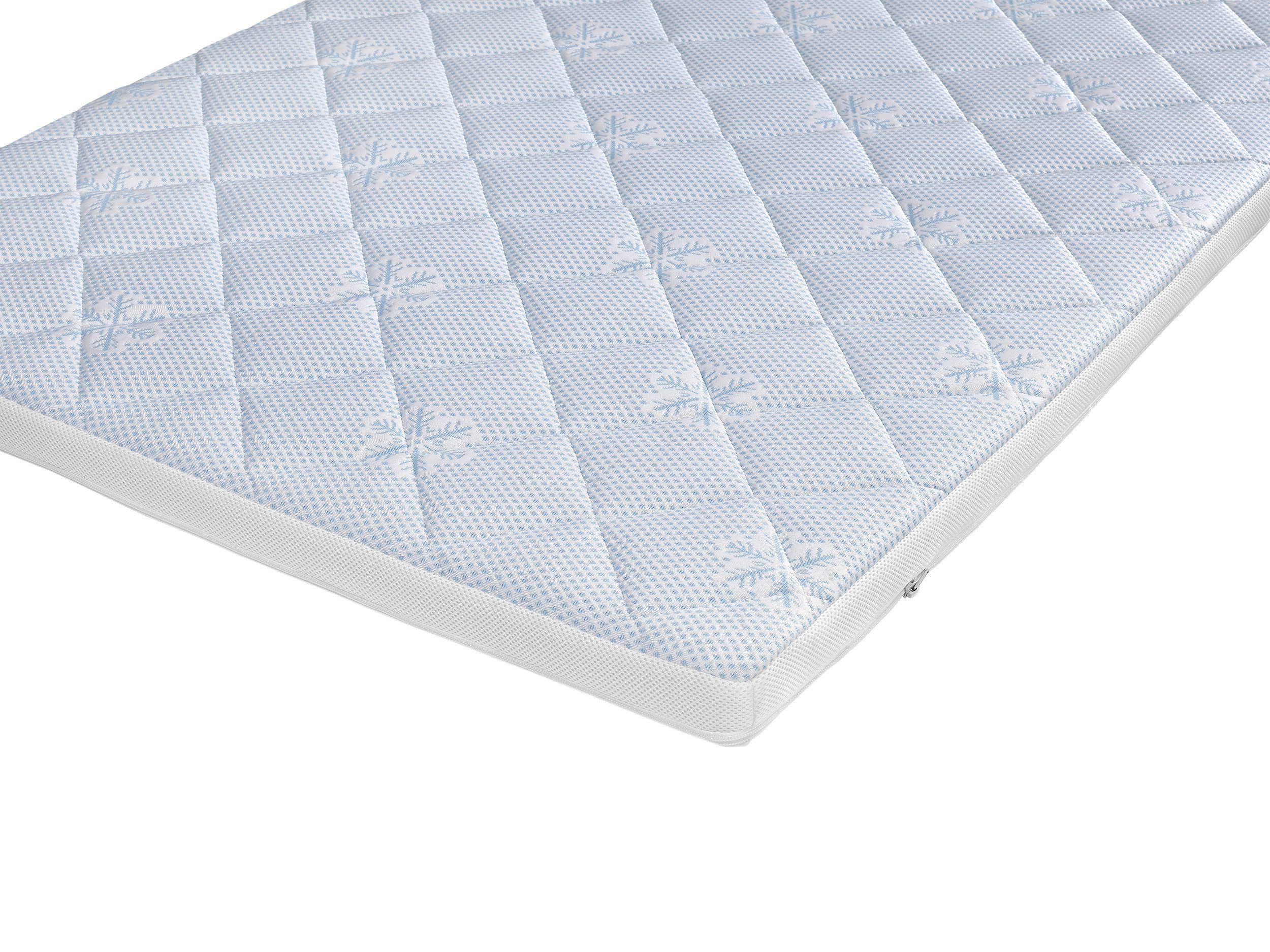 Der innovativ kühlende Topper in verschiedenen Größen bietet erholsame Nächte in jeder Hinsicht. Der stilvolle Außenbezug in strahlendem Weiß und sanftem Hellblau, verziert mit charmanten Schneeflocken-Piktogrammen, ist nicht nur ein optisches Highlight sondern sorgt auch für ein perfektes Schlafklima.
