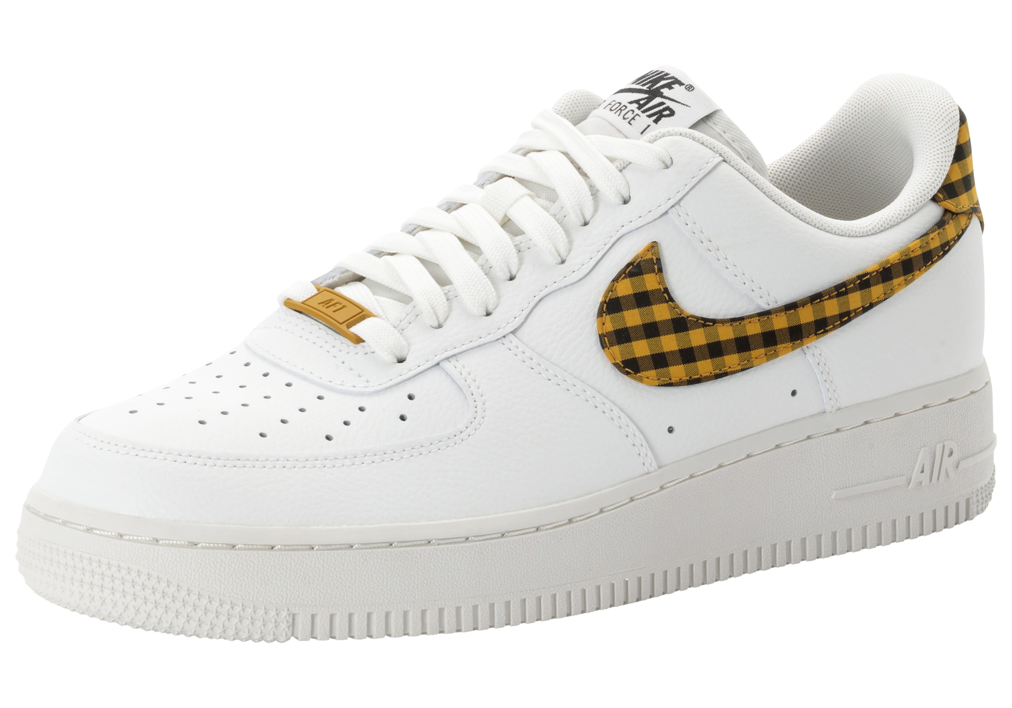 Schau dir die Sneaker »Nike Air Force 1 '07« von Nike Sportswear mal genauer an! Ein gekapseltes Air-Sole-Element aus komprimierter Luft macht das Laufen und Springen für die Füße sehr angenehm. Sohlen mit der Air-Technologie bieten eine gut Dämpfung und Sprungkraft. Ob du dich für die Standard-Schnürung über Kreuz oder für ganz ausgefallene Balken- oder Gitter-Вариантыn entscheidest: dein Schuh sitzt individuell und lässig.