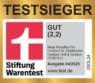 Der Ninja Woodfire Pro Connect Electric BBQ Grill & Smoker erzielt im Vergleichstest des Magazins „Stiftung Warentest“ mit acht weiteren Elektrogrills das Gesamtergebnis „GUT (2,2)“. Das „sehr gute“ Grillen des Grillgutes gelingt im Vergleich am besten, die Aufheizzeit ist gering und die Temperaturen auf der Grillfläche sind „gut“. Das Gerät ist einfach aufzubauen sowie in Betrieb zu nehmen und die „gute“ Grillpraxis überzeugt. Die Beschichtungen sind robust und das Modell ist „gut“ zu reparieren. Außerdem bietet es eine „gute“ Sicherheit und verbraucht es wenig Strom. Insgesamt ist der Elektrogrill zusammen mit drei anderen Modellen der „TESTSIEGER“.