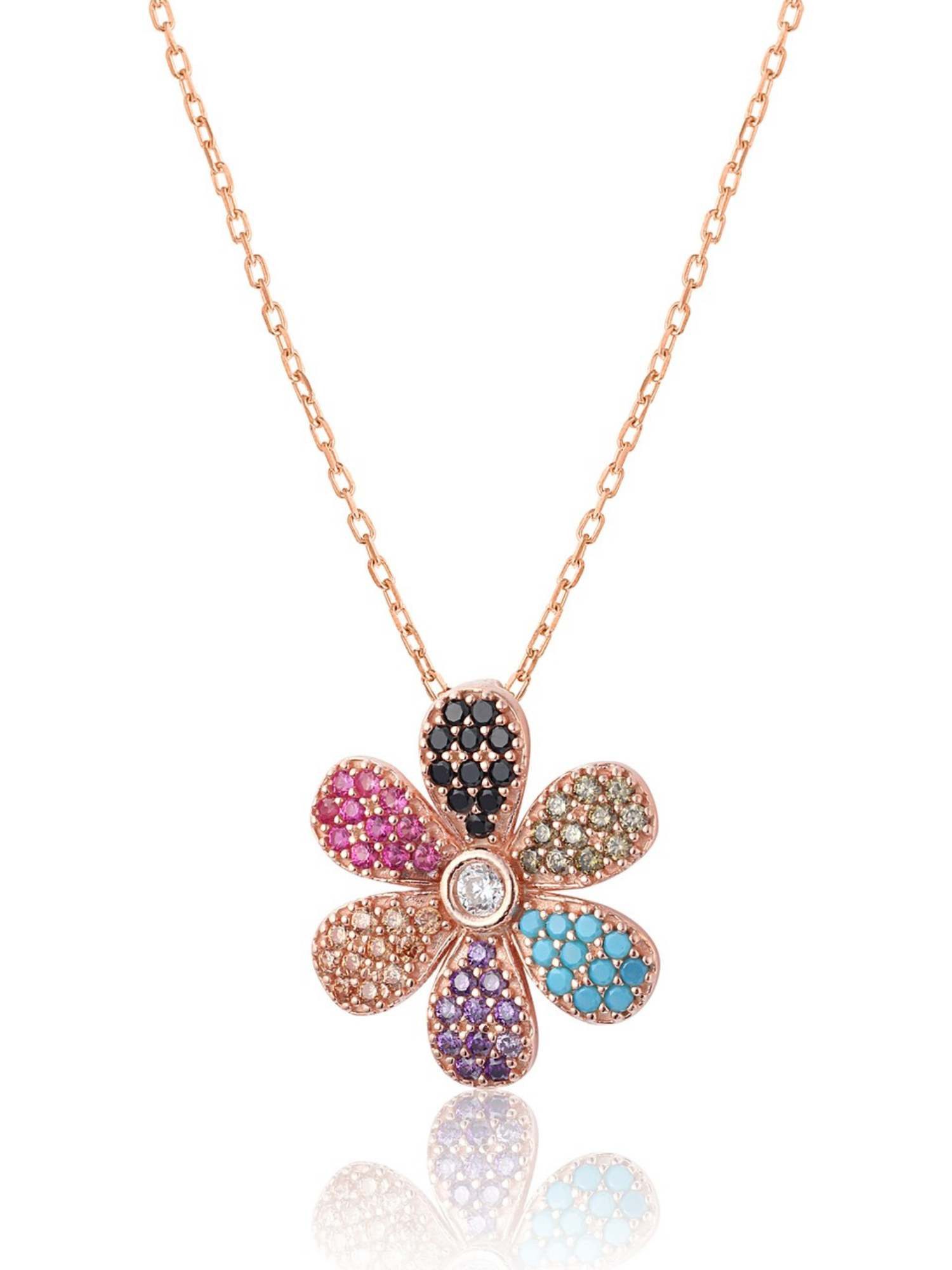 Diese elegante Halskette aus echtem 925er Sterling Silber besticht durch ihren detailreich gestalteten Blütenanhänger in Form einer Margerite. Die sechs Blütenblätter sind mit funkelnden, farbigen Zirkoniasteinen besetzt und der Anhänger ist mit einer hochwertigen Rosevergoldung veredelt.