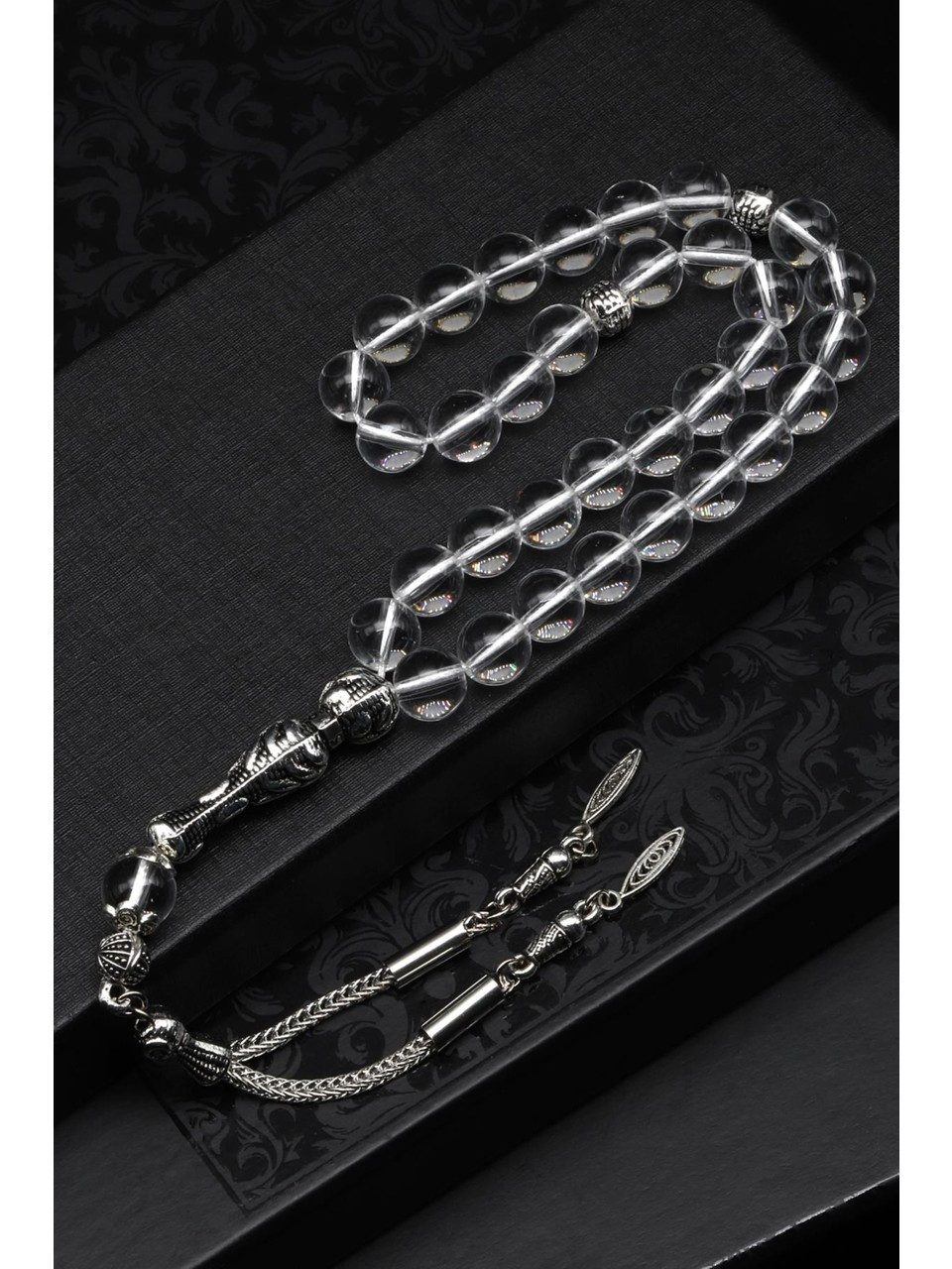 Diese edle Gebetskette besteht aus echtem Bergkristall (Klarquarz) und fein gearbeiteten silberfarbenen Metallelementen. Der Bergkristall gilt als „Stein der Klarheit“ und steht für Reinheit, Energie und geistige Balance. Jede der 33 Kugelperlen (8 mm) wurde sorgfältig geschliffen und poliert, wodurch sie einen brillanten Glanz erhält. Die detailreiche Quaste und der kunstvoll gestaltete Imame verleihen der Kette eine harmonische und elegante Optik.