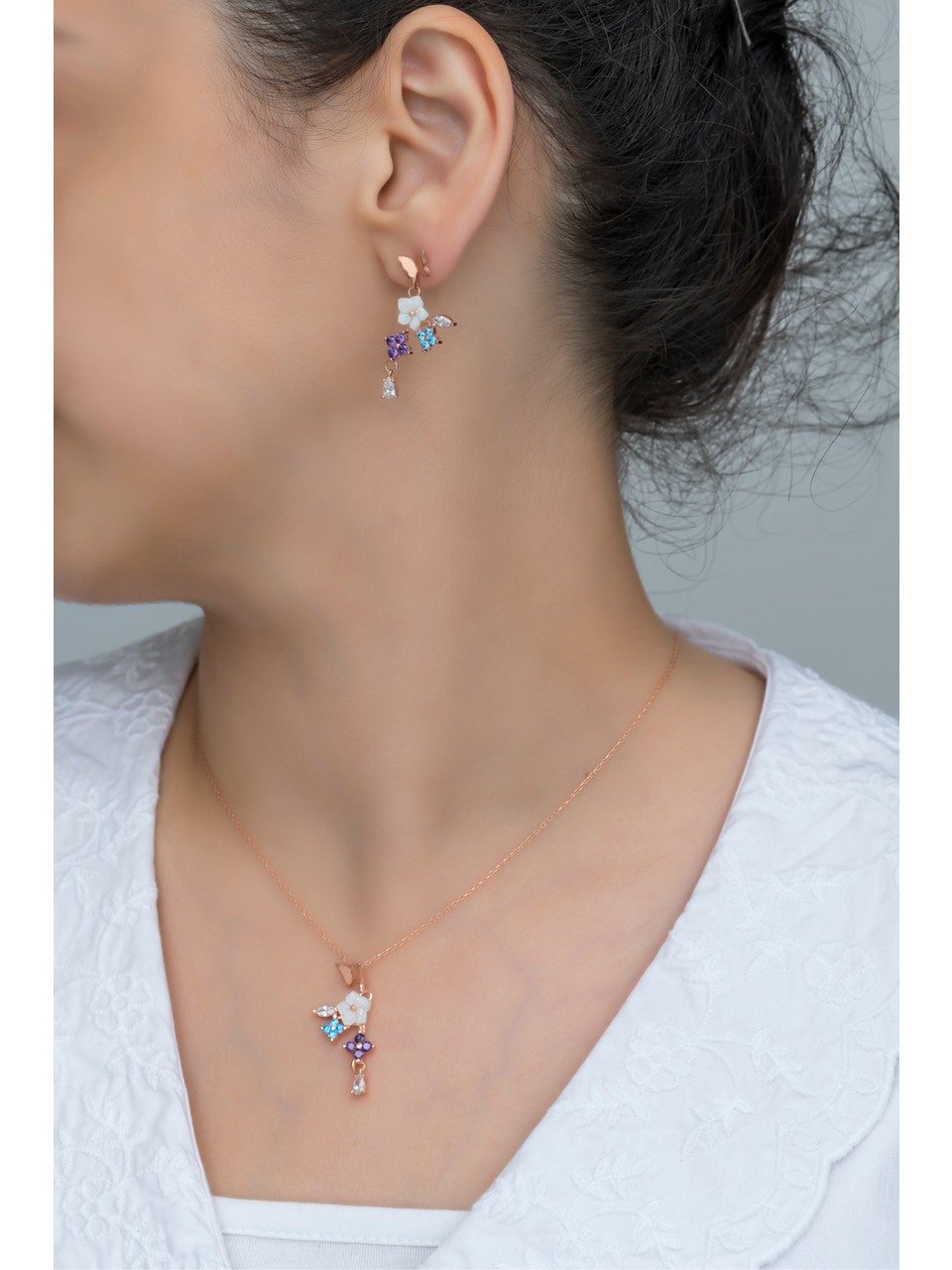 Dieses elegante Schmuckset aus 925 Sterling Silber besteht aus einer filigranen Halskette und passenden Ohrringen. Das Design ist inspiriert von Schmetterlingen, Blüten und Kleeblättern und wird durch funkelnde Zirkonia-Steine in Weiß, Blau und Violett veredelt. Die Roségoldbeschichtung verleiht dem Set einen warmen, modernen Glanz. Dank der feinen Verarbeitung ist es ein stilvolles Accessoire für Alltag und besondere Anlässe. Das Set wird in einer dekorativen Schmuckbox geliefert und eignet sich hervorragend als Geschenk.