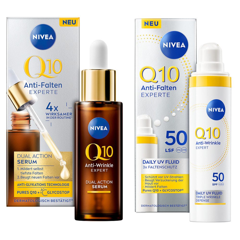 Inhaltsstoffe | NIVEA Q10 Anti-Falten EXPERTE Dual Action Serum: Aqua, Glycerin, Caprylic/Capric Triglyceride, Alcohol Denat., Cocoglycerides, Glyceryl Stearate Citrate, Butyrospermum Parkii Butter, Distarch Phosphate, Acteyl Hydroxyproline, Ubiquinone, 1-Methylhydantoin-2-Imide, Creatine, Hydroxyacetophenone, Xanthan Gum, Sodium Hydroxide, Phenoxyethanol, Pogostemon Cablin Oil, Parfum NIVEA Q10 Daily Anti-Falten LSF50 UVA UVB Daily UV Fluid: Aqua, Glycerin, Butyl Methoxydibenzoylmethane, Bis-Ethylhexyloxyphenol Methoxyphenyl Triazine, Isopropyl Palmitate, Alcohol Denat., C12-15 Alkyl Benzoate, Distarch Phosphate, Glyceryl Stearate, Dibutyl Adipate, Ethylhexyl Triazone, Butylene Glycol Dicaprylate/Dicaprate, Phenylbenzimidazole Sulfonic Acid, Tapioca Starch, Cetyl Alcohol, Stearyl Alcohol, Cocoglycerides, Diethylamino Hydroxybenzoyl Hexyl Benzoate, Ubiquinone, Creatine, 1-Methylhydantoin-2-Imide, Acetyl Hydroxyproline, Glycyrrhiza Inflata Root Extract, Sodium Stearoyl Glutamate, Caprylyl Glycol, Ethylhexylglycerin, Xanthan Gum, Trisodium EDTA, Sodium Hydroxide, Phenoxyethanol, Parfum Aktive Inhaltsstoffe: Q10, GLYCOSTOP |