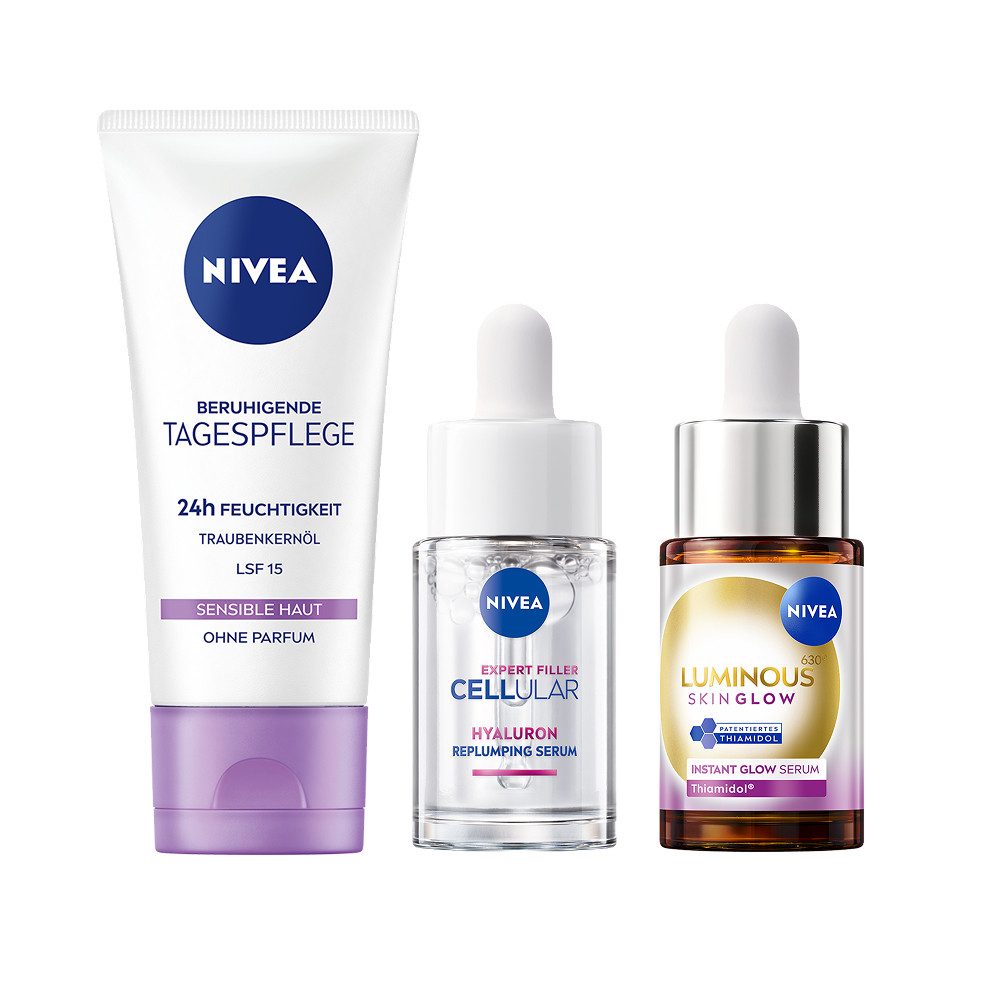 Lieferumfang | 1x NIVEA Beruhigende Tagespflege 24h Feuchtigkeit (50 ml), 1x NIVEA CELLULAR Expert Filler Hyaluron Replumping Serum (15 ml), 1x NIVEA LUMINOUS630® Skin Glow Instant Serum (15ml) |