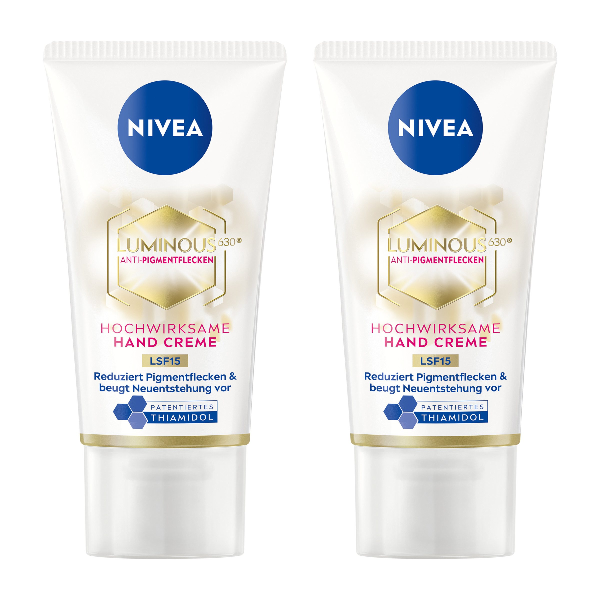 NIVEA LUMINOUS630 Hand Creme – DIE INNOVATION GEGEN PIGMENTFLECKEN. Nach 10 Jahren intensiver Forschung und der Prüfung von mehr als 50.000 Inhaltsstoffen hat NIVEA einen neuen Wirkstoff für die Reduzierung von Pigmentflecken entwickelt. Die hochwirksame Handcreme ist für die tägliche Anwendung geeignet*. Sichtbare Ergebnisse nach 4 Wochen. Nicht-fettende Formel. Die LUMINOUS630 Hand Creme reduziert Pigmentflecken und beugt ihrer Neuentstehung vor. LSF15 schützt vor lichtbedingter Hautalterung. Angereichert mit Hyaluron, spendet die Formel der Haut 24h intensive Feuchtigkeit. Für ebenmäßiger und jünger aussehende Hände: Unsere NIVEA LUMINOUS630 Hand Creme 50ml. Hautverträglichkeit dermatologisch bestätigt. *Verwenden Sie die Produkte mit LUMINOUS630 max. 4 Mal am Tag.