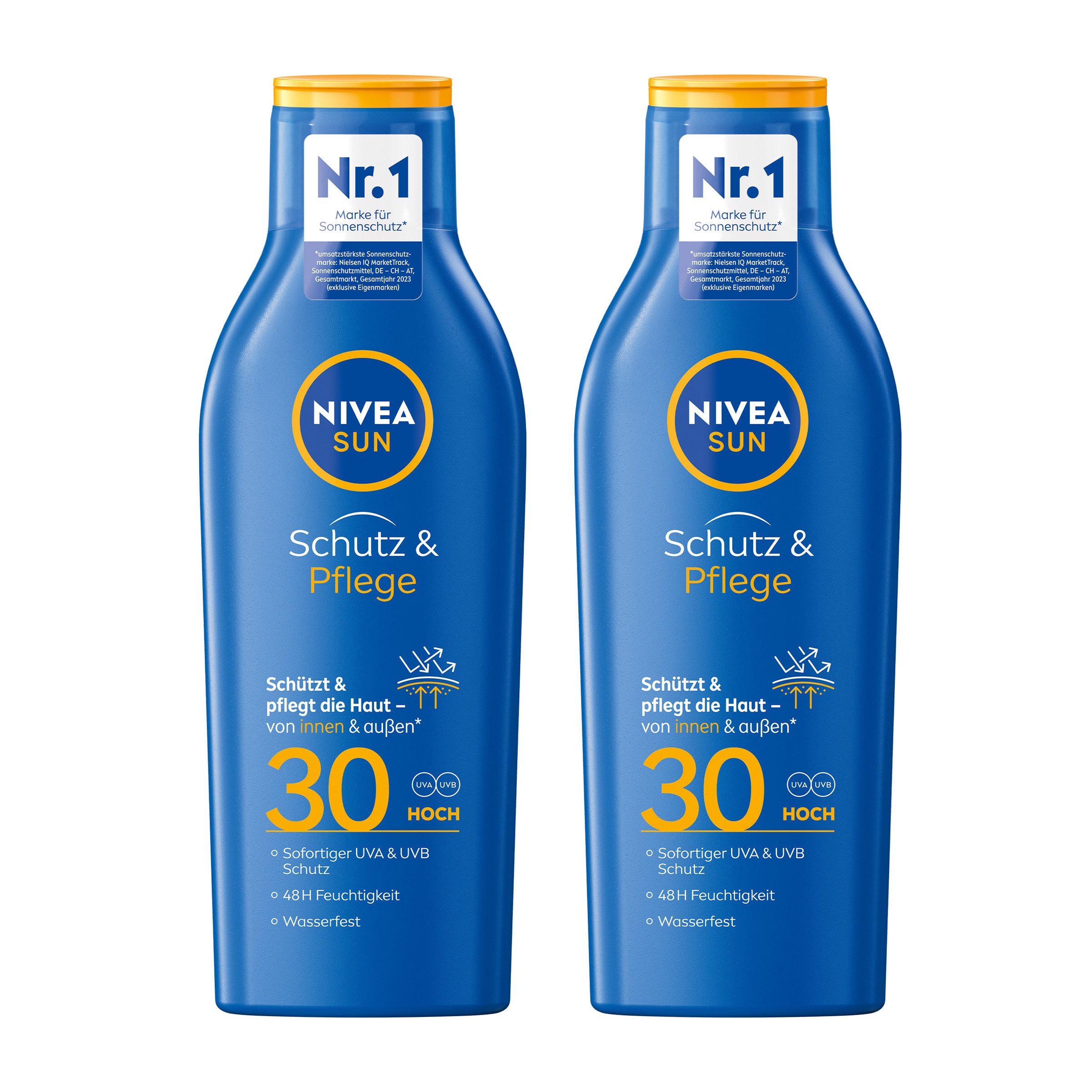 Die NIVEA SUN Schutz & Pflege Sonnenmilch LSF 30 schützt und pflegt die Haut von innen & außen. Sie schützt sofort vor UVA-/UVB-Strahlen, Sonnenbrand und vorzeitiger Hautalterung. Zusätzlich versorgt sie die Haut mit 48h Feuchtigkeit und unterstützt den Hautschutz von innen mit dem Antioxidans Vitamin E. Die Formel enthält außerdem 5% pures Glycerin, einen natürlichen Feuchtigkeitsspender, der die Haut vor dem Austrocknen schützt. Aus Rücksicht auf den Ozean ist die neue und verbesserte Formel der Sonnenmilch LSF 30 frei von umweltschädlichen Inhaltsstoffen. Die zu 82% biologisch abbaubare Sonnenmilch LSF 30 ist frei von Mikroplastik, Parabenen, Mineralöl und PEG. Auch erhältlich als Sonnenspray-Flasche und als Reisegröße. Der zuverlässige Schutz für sonnige Tage: Schutz & Pflege LSF 30 Sonnenmilch.