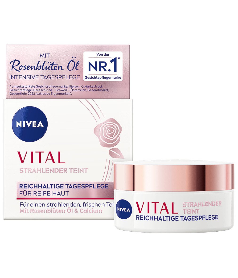 WEIL REIFE HAUT MEHR PFLEGE BRAUCHT Mit dem Alter verändert sich das Zellverhalten der Haut. Wichtige Funktionsweisen wie die Regenerationsfähigkeit und die Kollagenproduktion können sich verlangsamen. Dies führt zu Faltenbildung und zum Verlust der Straffheit und der natürlichen Strahlkraft der Haut. WÜNSCHEN SIE SICH EINEN STRAHLEND FRISCHEN TEINT? Bei regelmäßiger Anwendung verleiht die Formel mit Rosenblüten-Öl und Calcium einen gesund aussehenden, strahlenden Teint und stärkt die Widerstandsfähigkeit der Haut, um nicht auszutrocknen. Die samtige Creme mit dem Duft der Rose schenkt Ihrer Haut ein sofort entspanntes Hautgefühl, welches den ganzen Tag anhält. Für vitale, gesund aussehende Haut, die strahlt. Ebenfalls erhältlich: NIVEA VITAL Strahlender Teint 3-in-1 Beauty Serum.