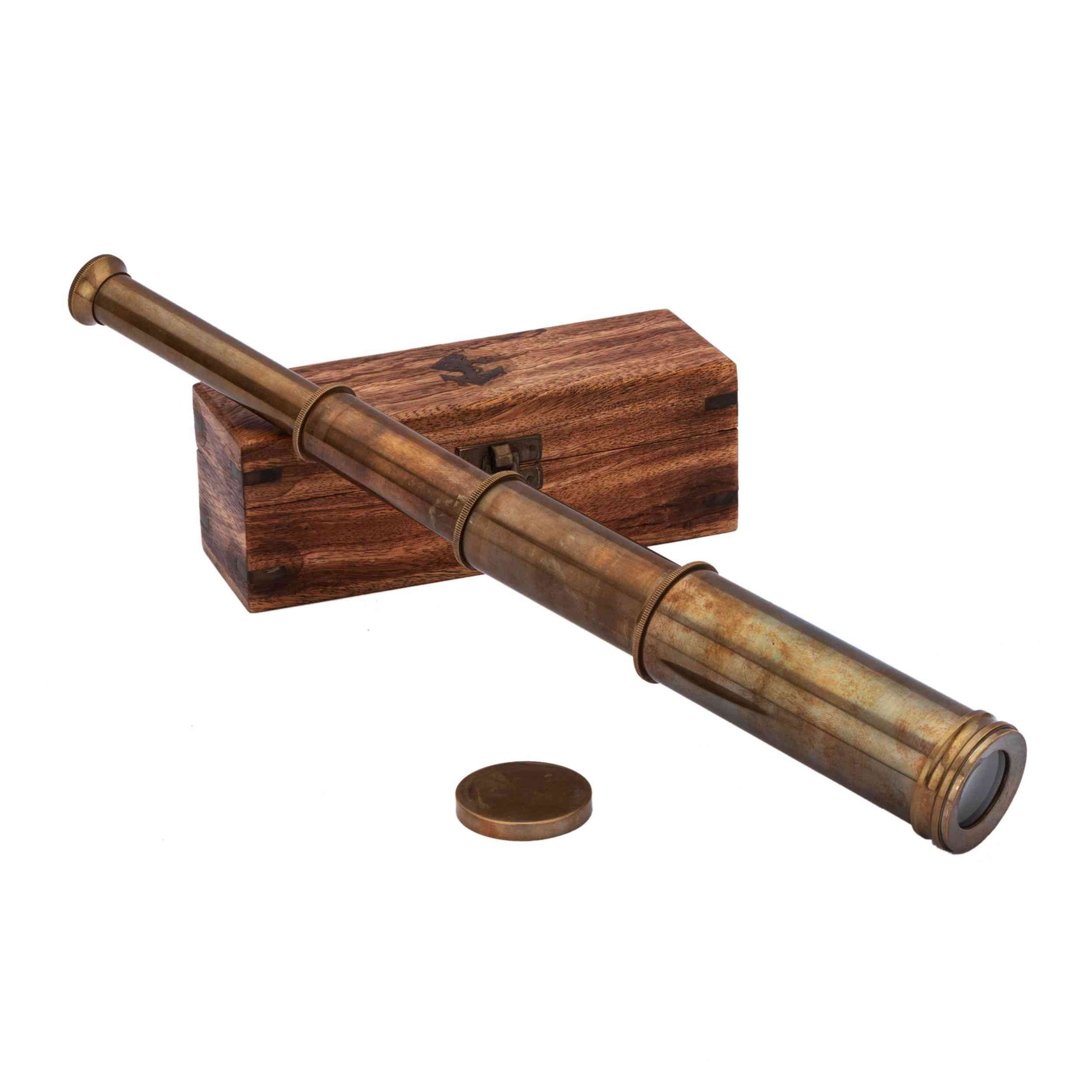 Dekofigur Teleskop aus antikem Messing, 35cm, in Holzbox – Retro Nautisches Tele