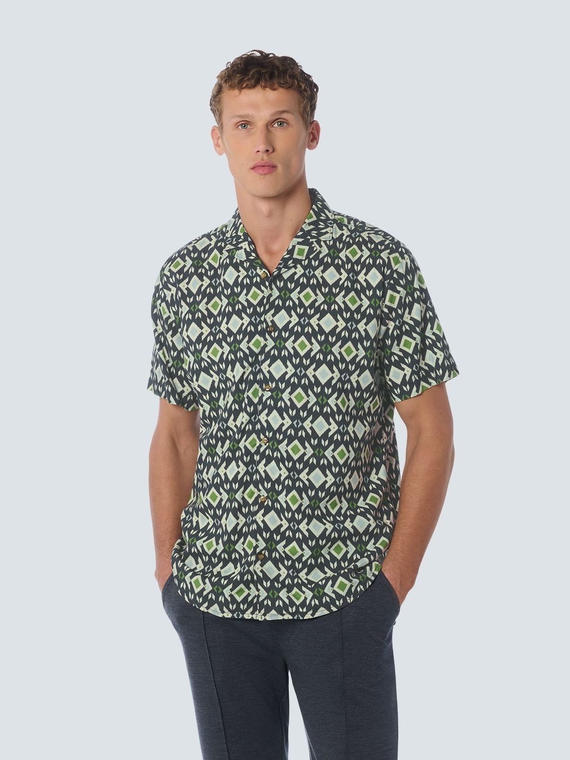 Ein farbenfrohes Kurzarmhemd von No Excess mit Resort-Kragen. Die Farbpalette spiegelt die lebendige andalusische Kultur mit einem nomadisch inspirierten Druck wider. Dieses Modell hat eine normale Passform und ist aus einem geschmeidigen Stoff gefertigt, der weich auf der Haut liegt und angenehm zu tragen ist. Es ist dünn, fühlt sich kühl an und eignet sich daher sehr gut für den Sommer.