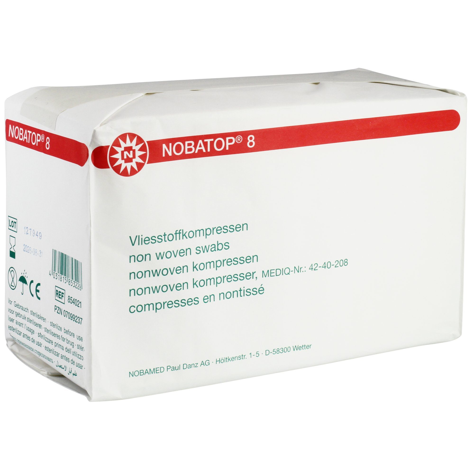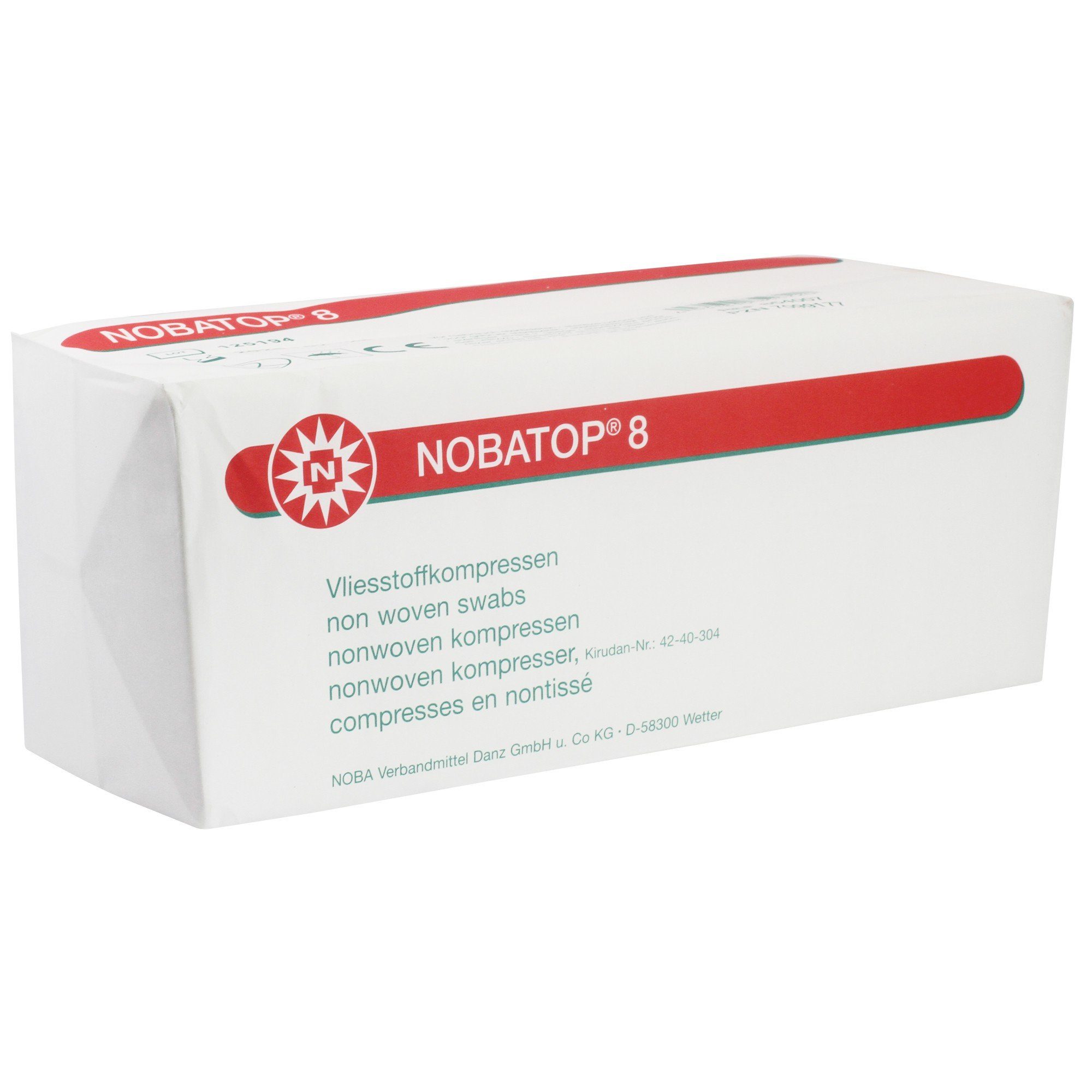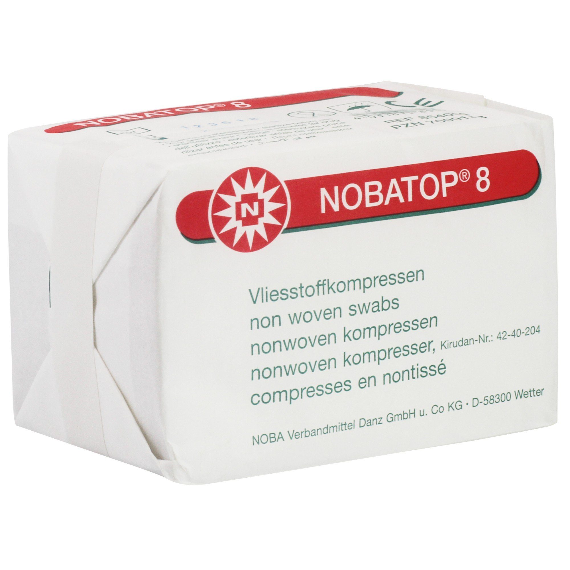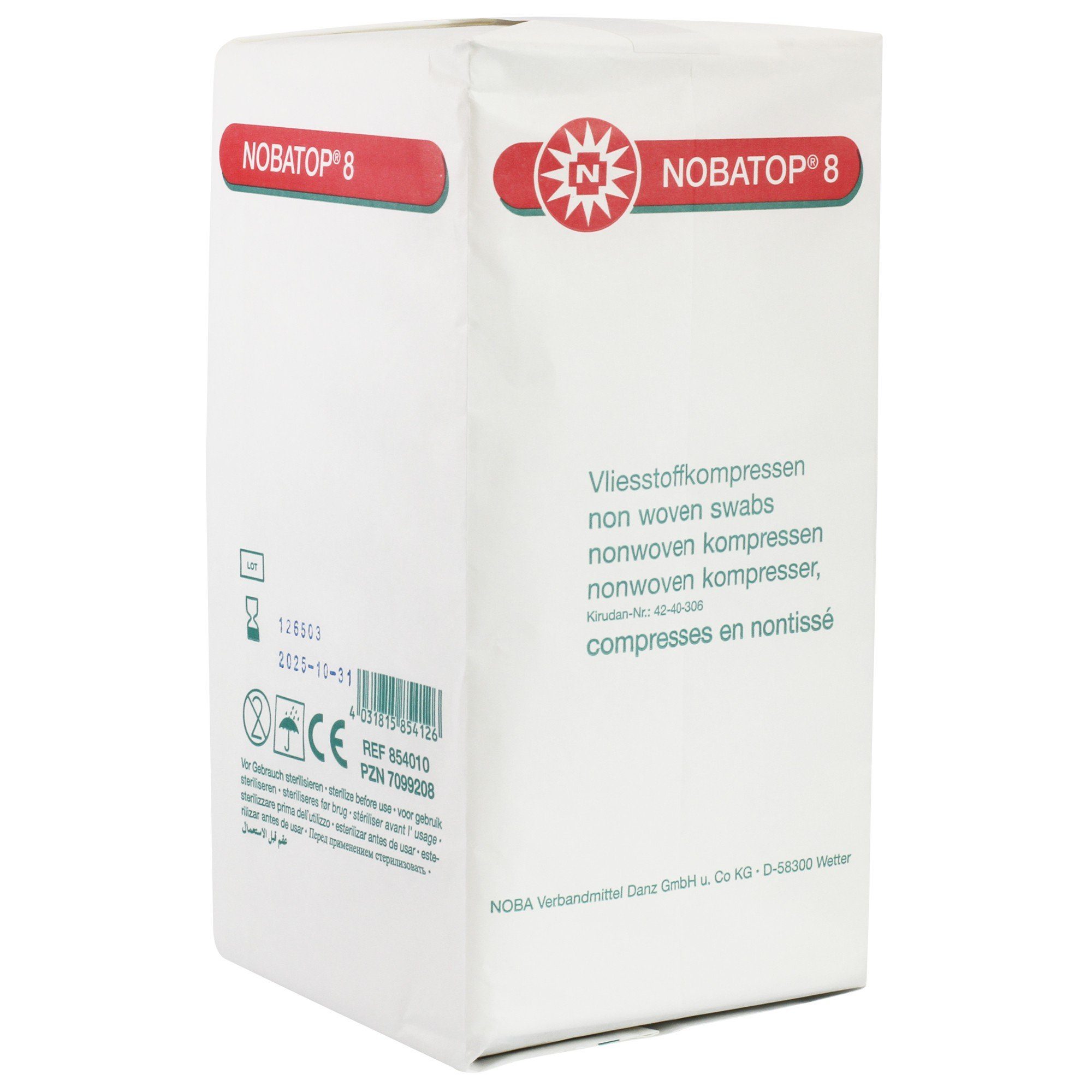 NOBATOP 8 sind 4-fach gelegte Vliesstoffkompressen. Die Kompressen aus bindemittelfrei hergestelltem Vliesstoff verfügen über eine hohe Saugkraft, die mit einer 8-fach gelegten Mullkompresse vergleichbar ist. NOBATOP 8 bieten hohen Tragekomfort aufgrund des sehr weichen Materials. Daher sind sie besonders gut als Träger für Salbenverbände und zur Mundpflege geeignet. Da die Kompressen sterilisierbar sind, können sie zur Abdeckung von Wunden eingesetzt werden. Vor der Verwendung müssen sie mit einem validierten Verfahren sterilisiert werden.