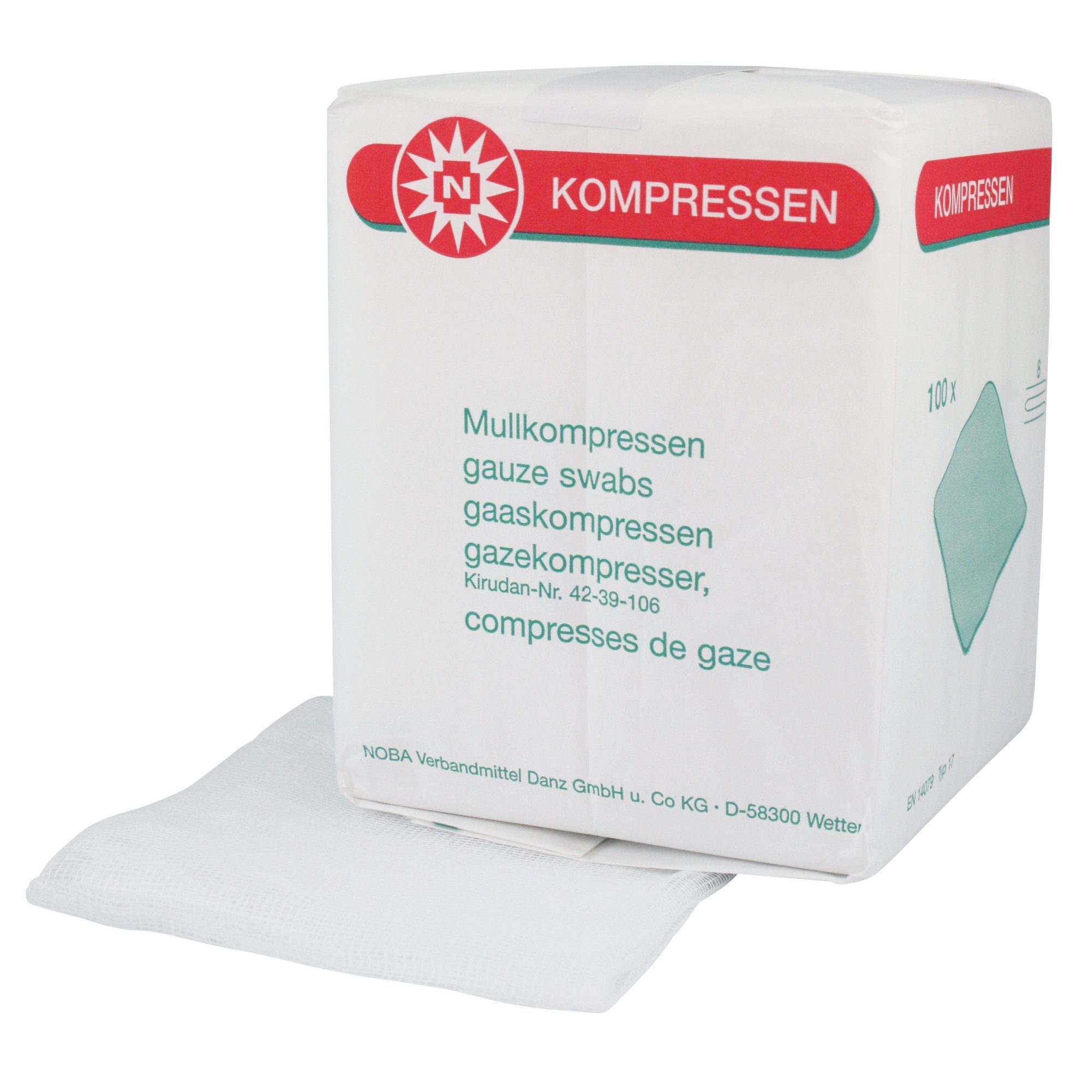 Die unsterile Mullkompresse aus Verbandmull von NOBAMED verfügt über eine eingeschlagene Schnittkante. Die Kompresse muss vor ihrer Verwendung auf offenen Wunden mit einem validierten Verfahren sterilisiert werden. In jeder Packung befinden sich 100 Kompressen.