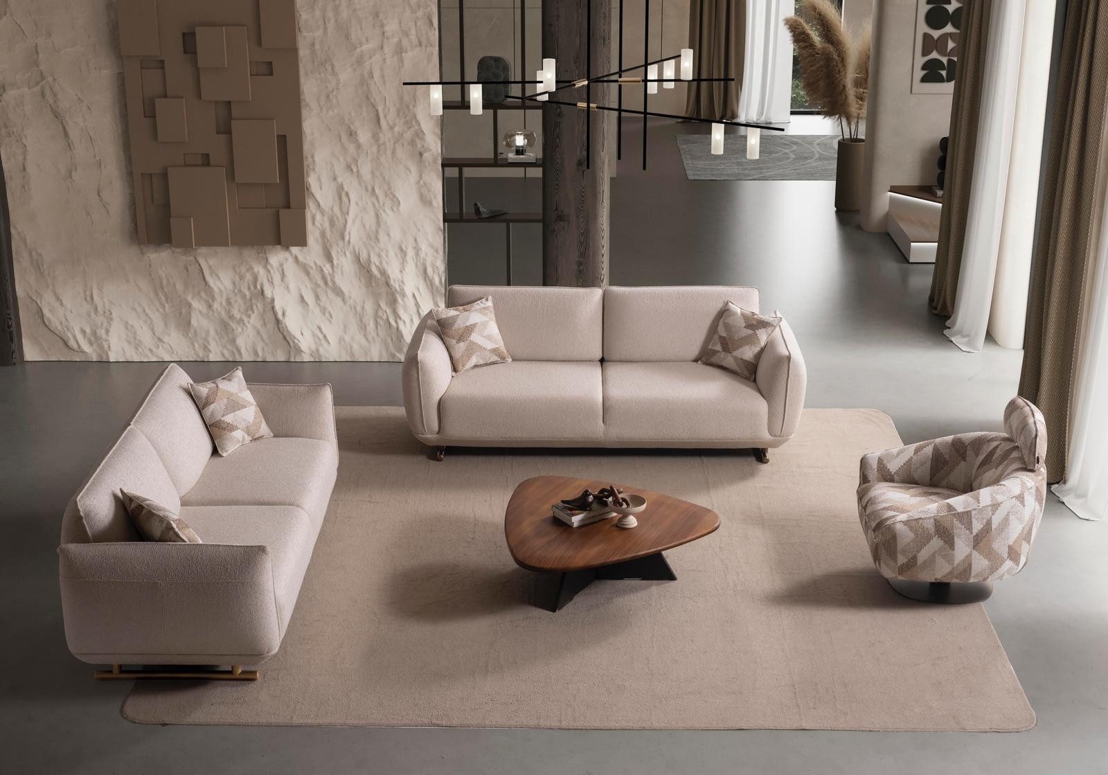 Die Sitzflächen sind mit hochwertigem 32-Dichte-Schaumstoff gepolstert, der für eine angenehme Balance aus Weichheit und Unterstützung sorgt. Der robuste Buchenholzrahmen garantiert Stabilität und Langlebigkeit – perfekt für den täglichen Gebrauch. Der gewebte Stoffbezug verleiht der Garnitur nicht nur eine edle Optik, sondern fühlt sich auch angenehm an und ist pflegeleicht.