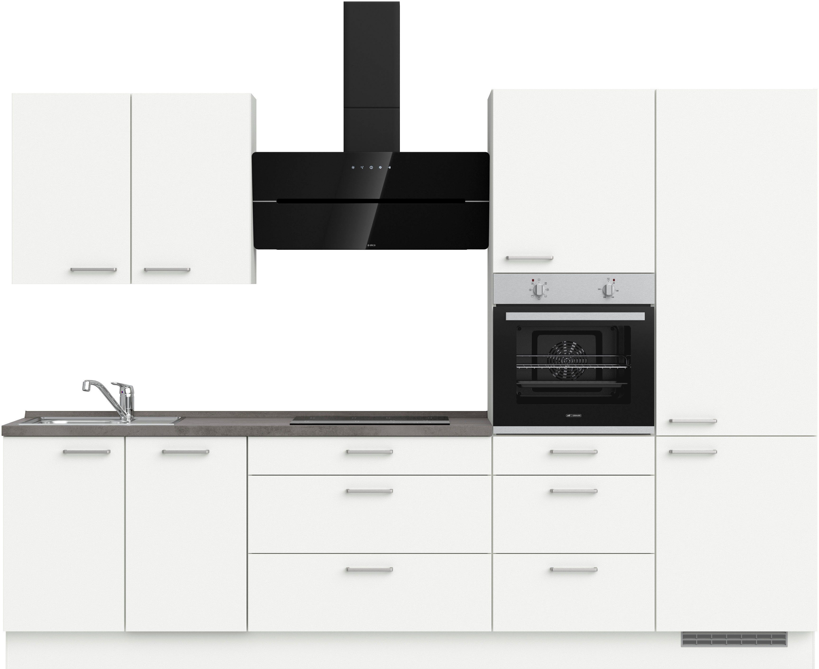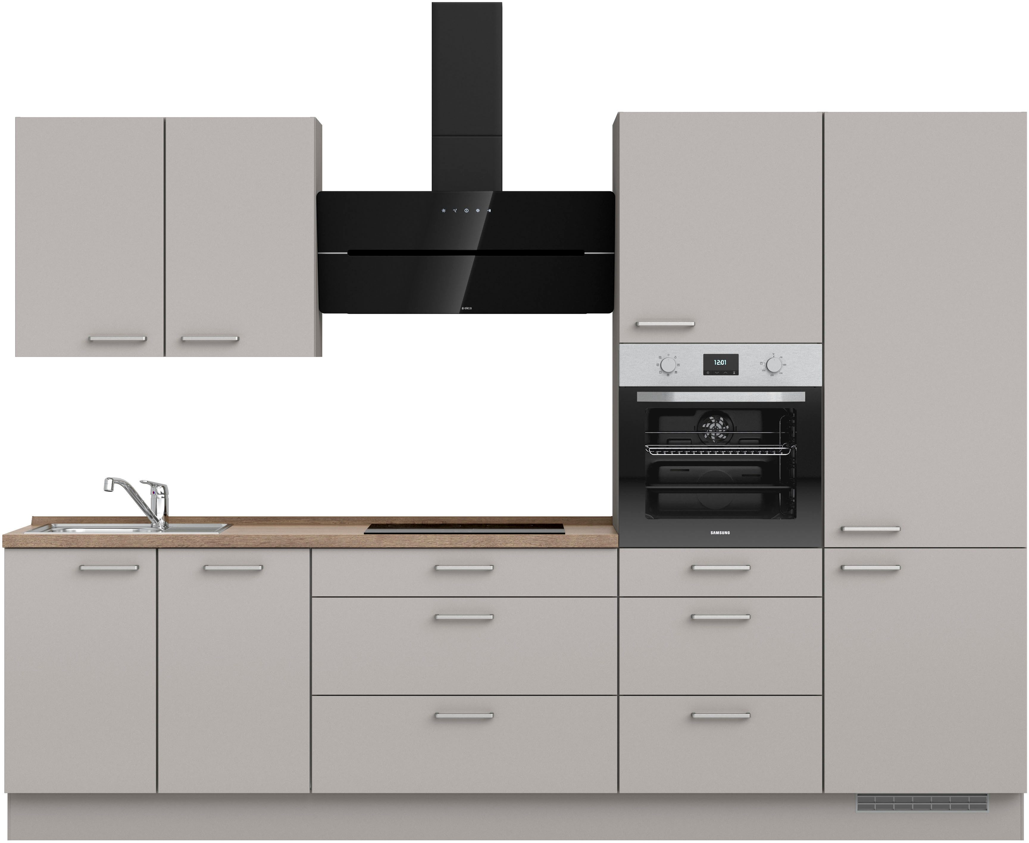 Ausstattung | Durchgehende Arbeitsplatte Einlegeböden höhenverstellbar Metallgriffe Schubkästen mit Soft-Close-Funktion Türen mit Soft-Close-Funktion Wandabschlussleiste |