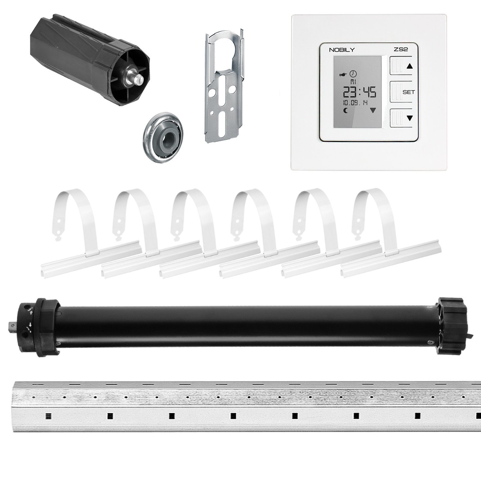 Sie haben sich für unser leistungsstarkes Rollladen-Komplett-Set in neuester Ausführung entschieden? Eine gute Wahl, bewegen Sie Ihre Rollläden automatisch und sparen Sie Zeit und Geld! Mehr Komfort im täglichen Alltag, die ideale Lösung zum Nachrüsten bei bestehenden Rollläden oder ganz unkompliziert als komplette Neuinstallation Bei NOBILY finden Sie alles, was Sie zur Installation oder Nachrüstung benötigen. Unsere Komplett-Sets sind in folgenden Вариантыn verfügbar: P5 10/15-60 60mm Welle - bis 25Kg - Bis zu einer Gesamtlänge von 1 Meter P5 10/15-60 60mm Welle - bis 25Kg - Bis zu einer Gesamtlänge von 1,50 Meter P5 20/15-60 60mm Welle - bis 50Kg - Bis zu einer Gesamtlänge von 1,50 Meter P5 20/15-60 60mm Welle - bis 50Kg - Bis zu einer Gesamtlänge von 2 Meter P5 20/15-60 60mm Welle - bis 50Kg - Bis zu einer Gesamtlänge von 2,75 Meter P5 30/15-60 60mm Welle - bis 75Kg - Bis zu einer Gesamtlänge von 2 Meter P5 30/15-60 60mm Welle - bis 75Kg - Bis zu einer Gesamtlänge von 2,75 Meter P5 30/15-60 60mm Welle - bis 75Kg - Bis zu einer Gesamtlänge von 3,50 Meter Die ZS2 von Nobily ist eine Profi-Rollladenzeitschaltuhr, welche smart und einfach im Schalterprogramm integriert werden kann. Durch ihre kompakte Bauform von 50x50mm und die Harmonie des Designs mit Programmen führender Schalterhersteller, ist unsere ZS2 ideal für jeden Wohnbereich geeignet. Besonderheiten: - Tagesprogramm - Profi-Rollladenzeitschaltuhr ZS2 - Zuverlässig und edel im Design - Made in Germany - 2 Jahre Garantie - Exklusiv nur bei NOBILY erhältlich - Integrierbar in alle gängigen Markenschalterprogramme wie Merten, Busch-Jaeger ... Produkthighlights - Tagesprogramm - Wochenprogramm - Handbetrieb (Tippbetrieb) - Automatikbetrieb (Selbsthaltung) - Security- Urlaubsschaltung (Zufallsgenerator) - Astroprogramm ist optional abschaltbar - Dämmerungsprogramm - Memory- Funktion (Schnellprogrammierung) - Gangreserve (± 0,45 h) - adaptierbar in diverse Markenschalterprogramme mit 50 x 50 mm Zwischenrahmen - Oberfläche ultraweiß - inkl. Unterputzrahmen