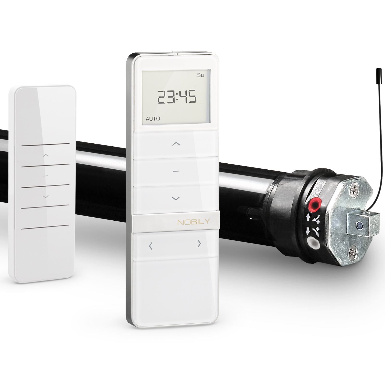 Lieferumfang | 1x Rolladenmotor, 1x Timer Exquisit Handsender, 1x 40mm Achtkantadaptersatz, 1x Universallager |