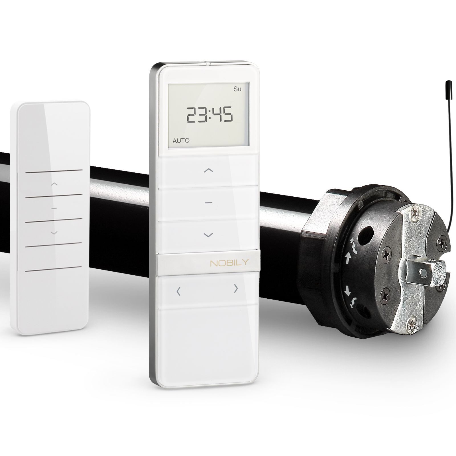 Lieferumfang | 1x Rolladenmotor, 1x Timer Exquisit Handsender, 1x 60mm Achtkantadaptersatz, 1x Universallager |