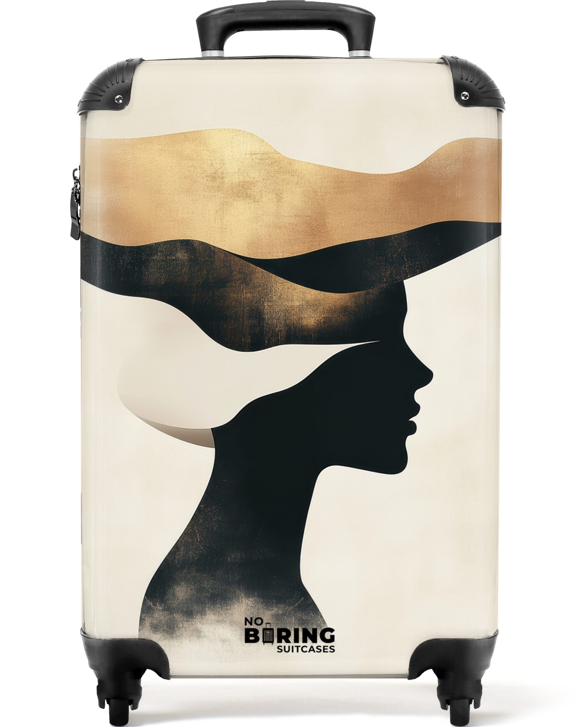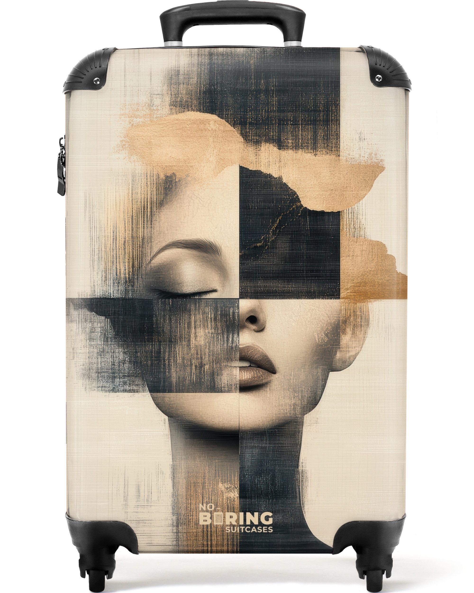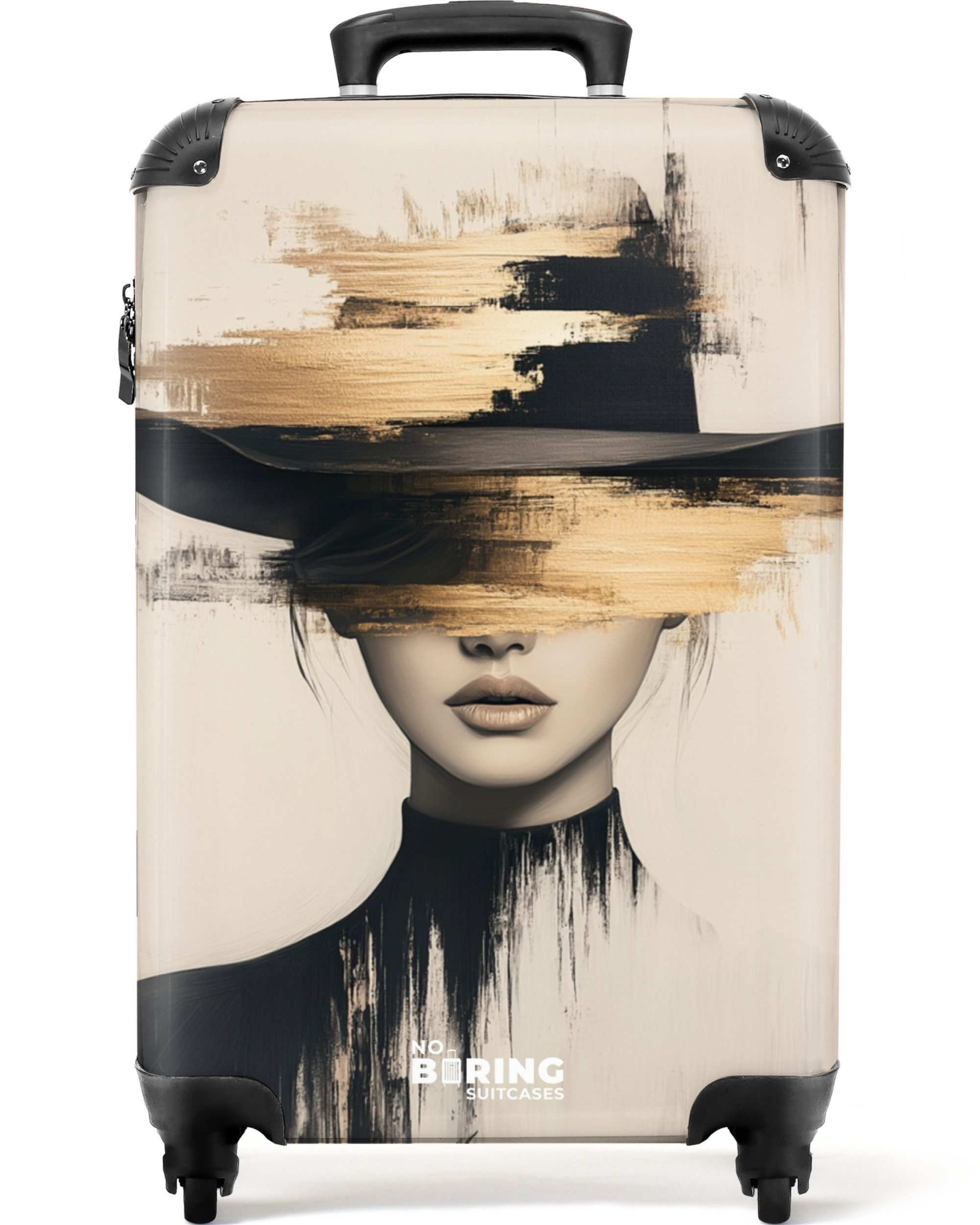 Stilisiertes Porträt einer Frau mit schwarzem Hut und beigen Lippen, teilweise verblasst mit breiten Pinselstrichen in Schwarz und Gold auf hellem Hintergrund.Optik | bedruckt |