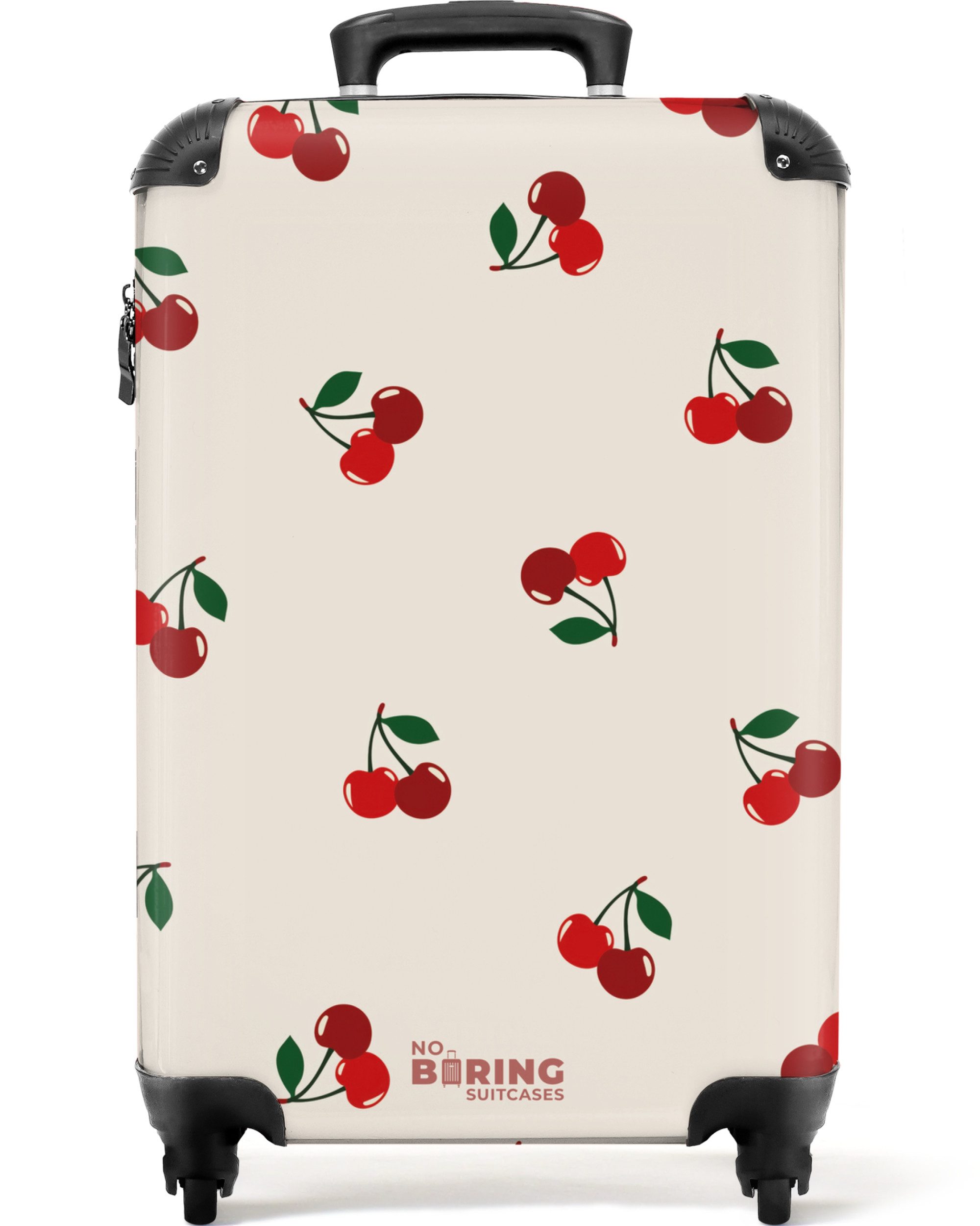 Heller cremefarbener Hintergrund mit verstreuten Abbildungen von roten Kirschen mit grünen Blättern.Optik | bedruckt |