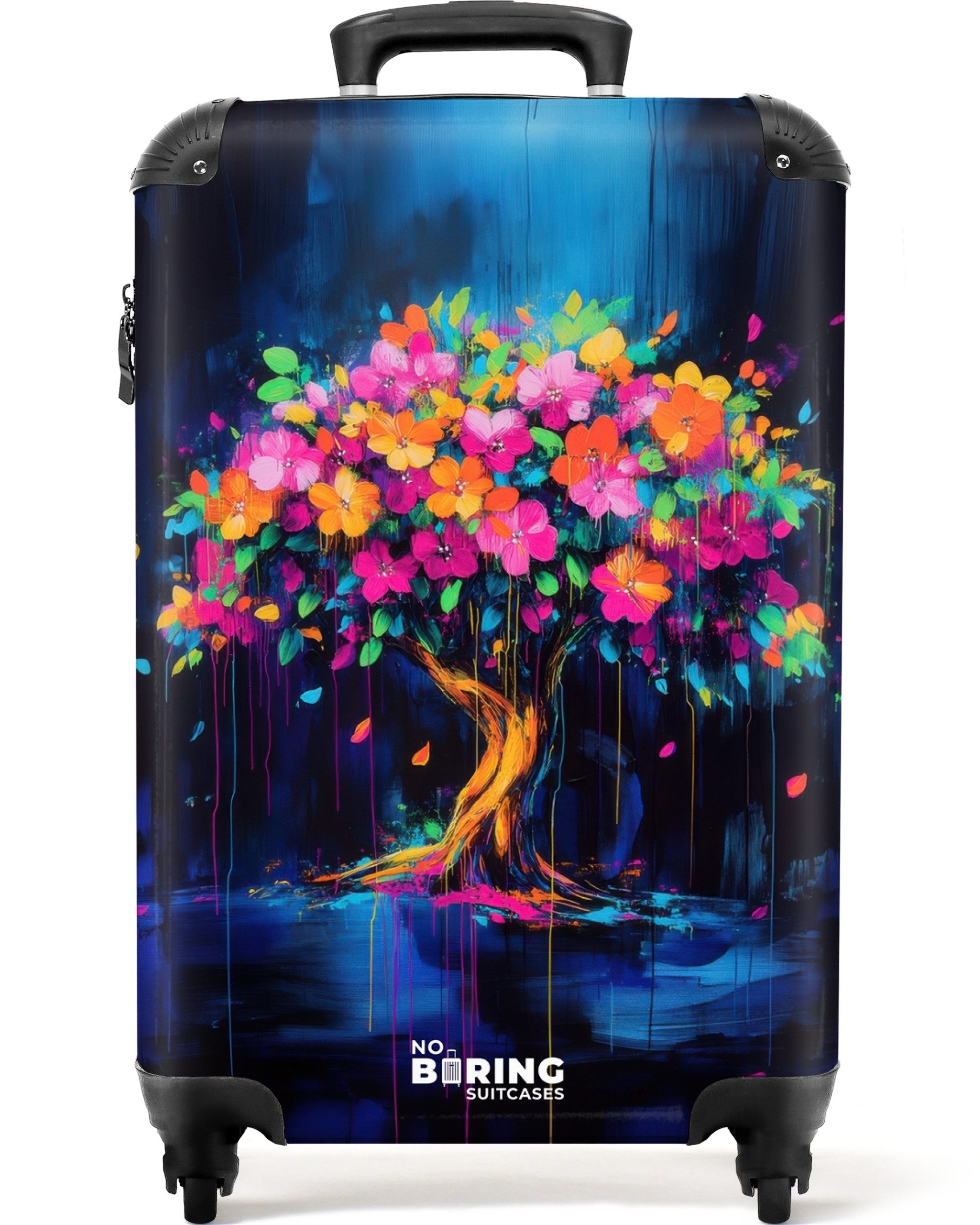 Ein verschnörkelter Baum voller bunter Blumen und fallender Blätter auf einem tiefblauen Hintergrund mit Farbspritzern.Optik | bedruckt |