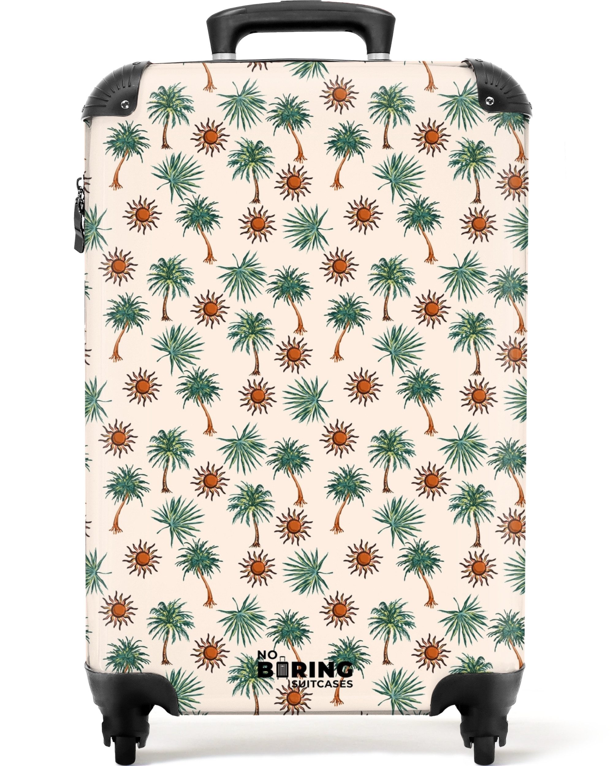 Ein fröhliches Muster aus handgezeichneten Palmen und orangefarbenen Sonnen, gleichmäßig verteilt auf einem beigen Hintergrund. Die Illustrationen haben einen verspielten und sommerlichen Charakter.Optik | bedruckt |