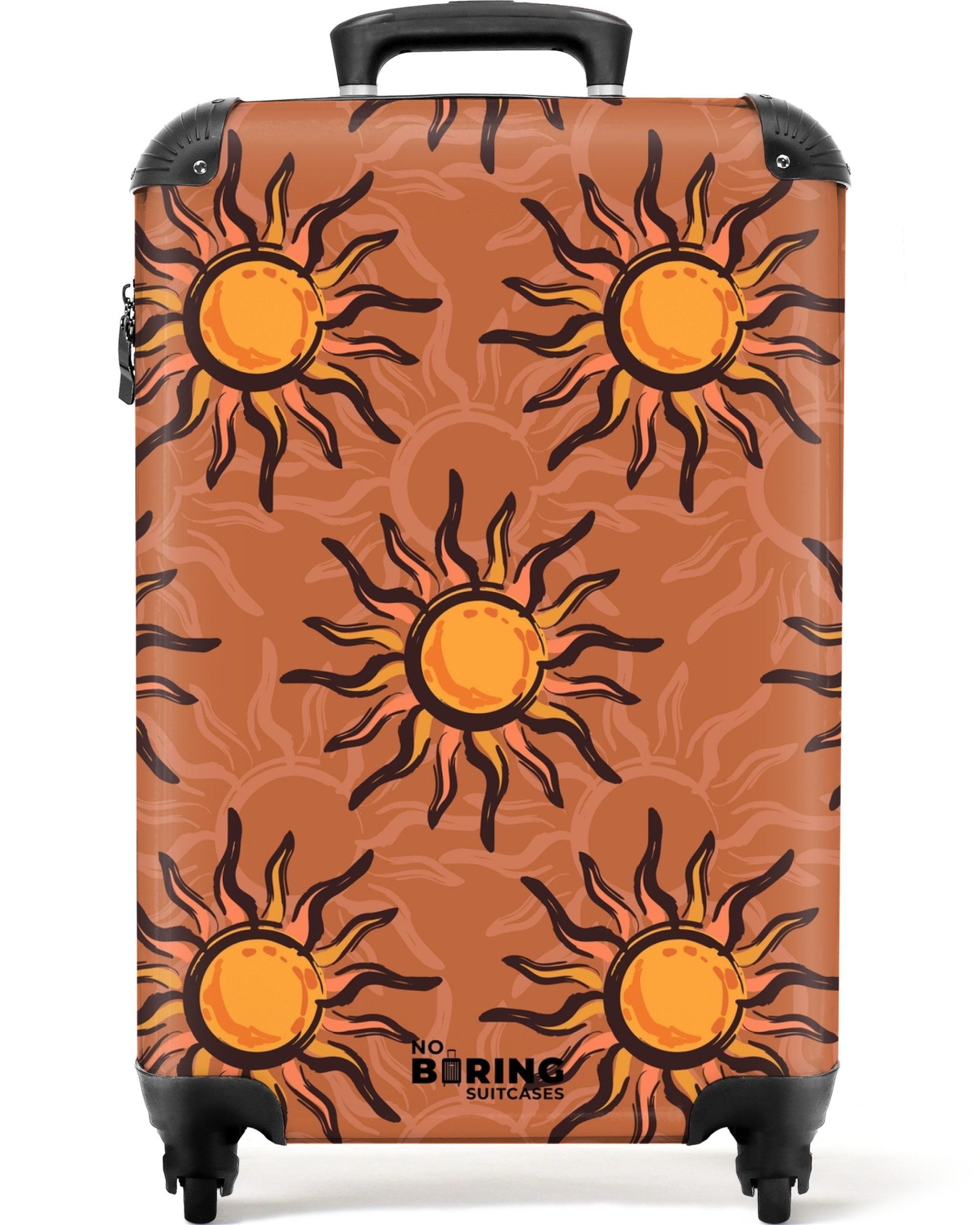 Ein lebhaftes Muster aus großen, handgezeichneten gelben Sonnen mit gewellten Strahlen auf einem warmen Terrakotta-Hintergrund mit subtilen Sonnenformen in einem helleren Farbton.Optik | bedruckt |