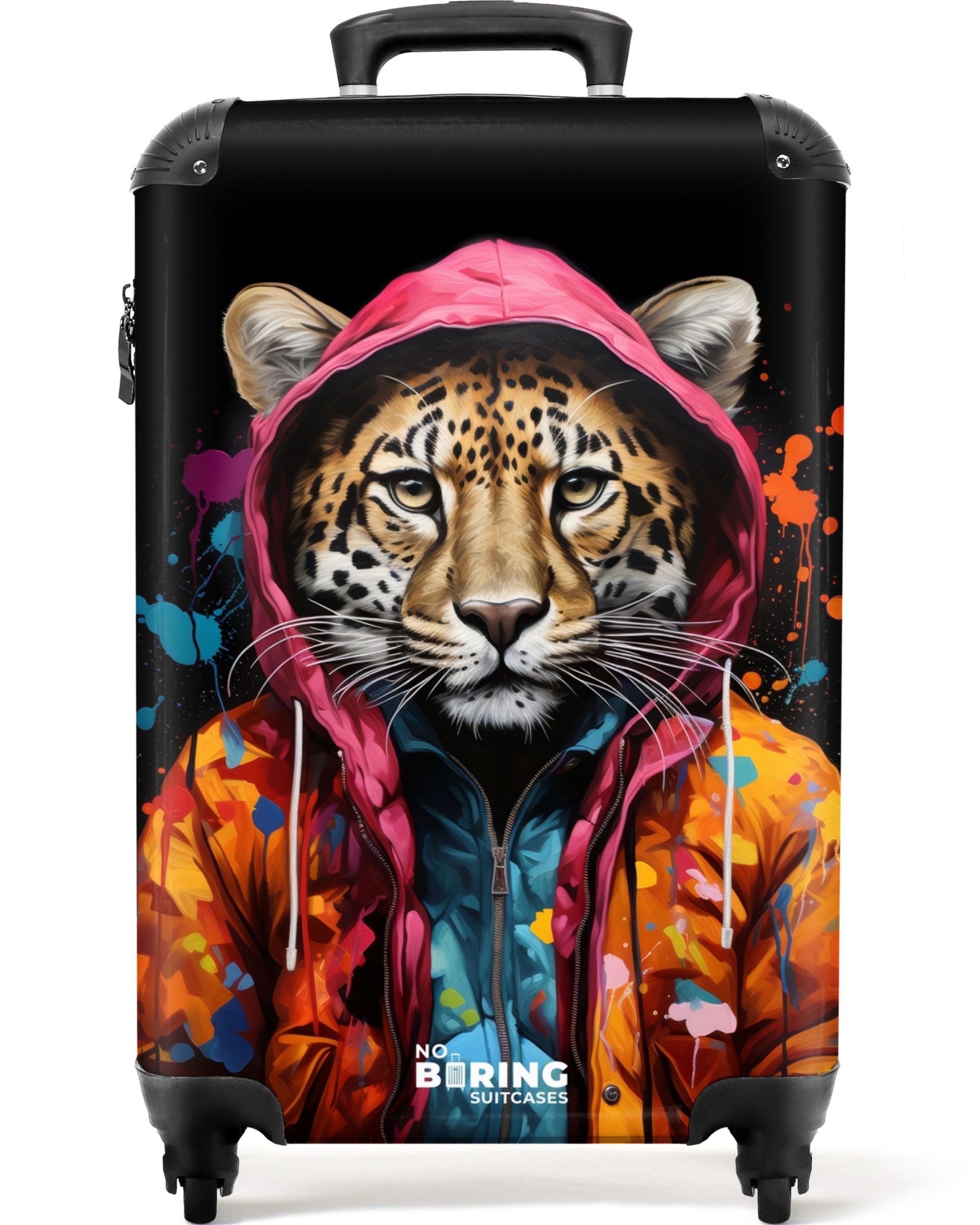 Ein Leopard mit buntem Mantel und Kapuze auf schwarzem HintergrundOptik | bedruckt |