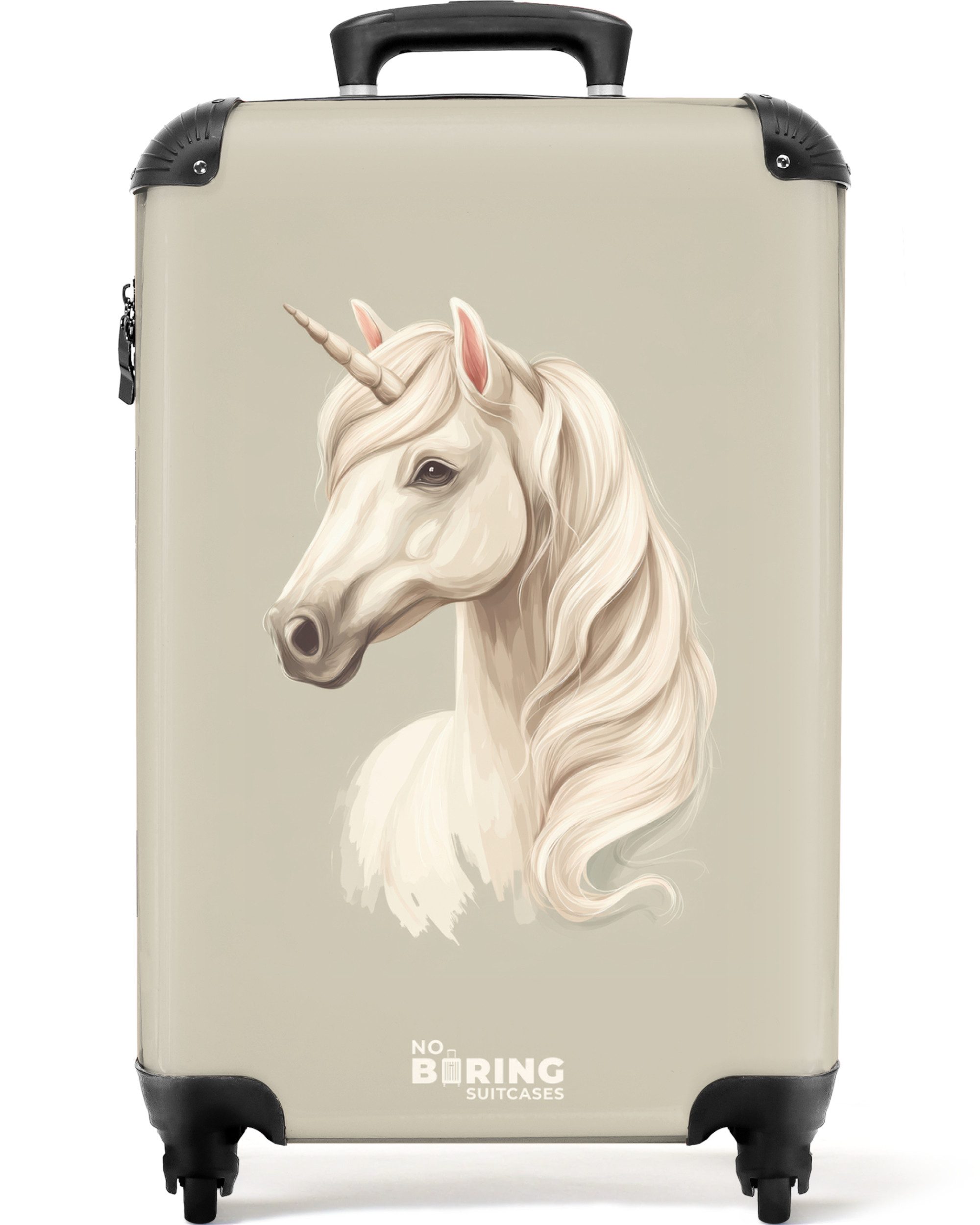 Realistisch gezeichnetes weißes Einhorn mit langer gewellter Mähne und gedrehtem Horn, auf taupefarbenem Hintergrund.Optik | bedruckt |