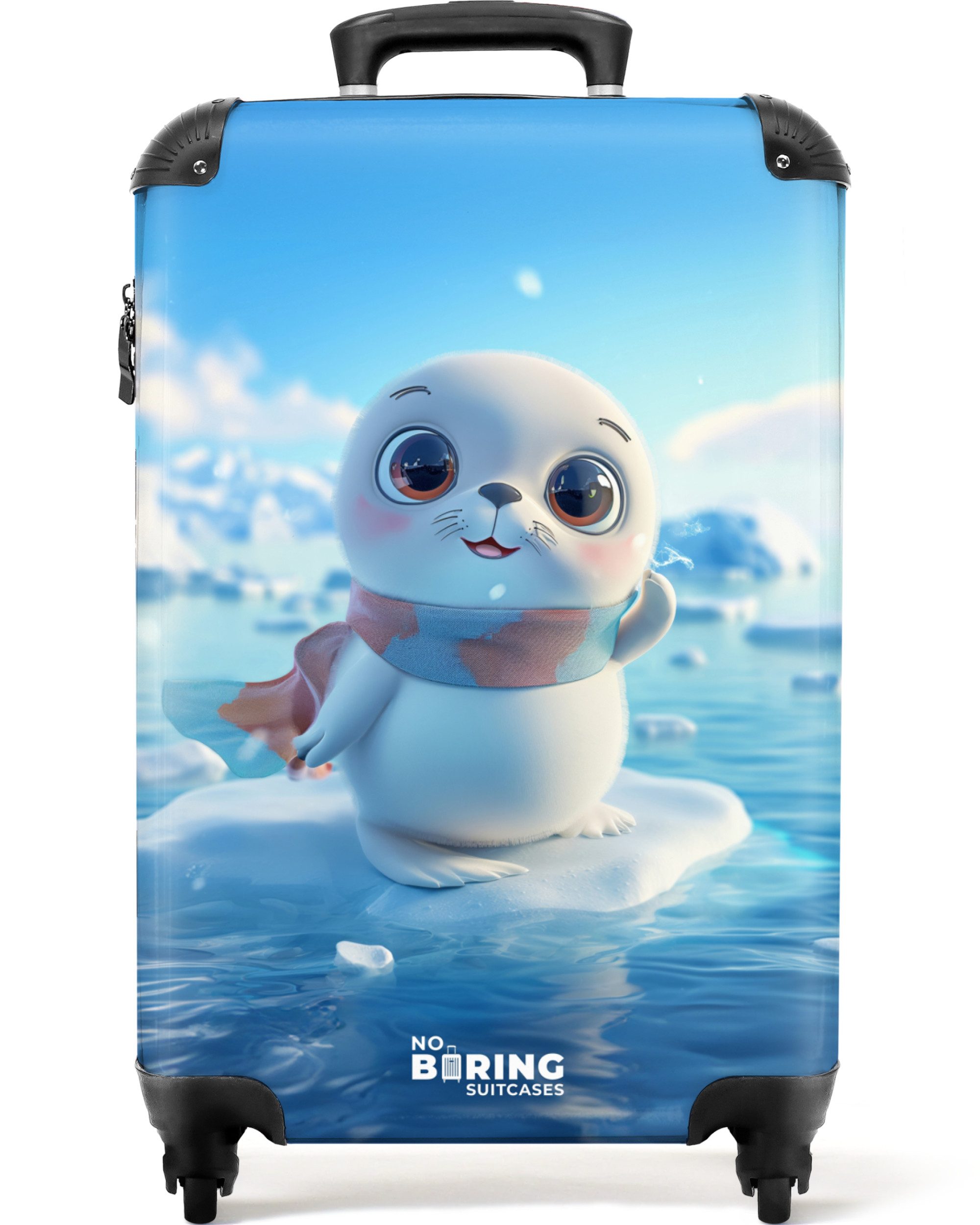 Eine niedliche Robbe sitzt auf einer Eisscholle inmitten einer hellblauen, eisigen Umgebung. Die Robbe trägt einen Schal und blickt mit großen, süßen Augen nach vorne.Optik | bedruckt |